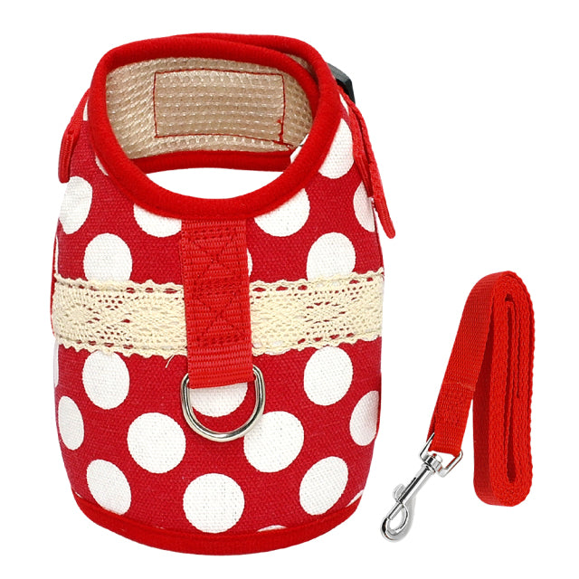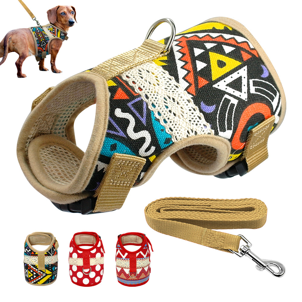 A dog harness with a padded vest and leash for small dogs such as Yorkies, Pugs, and Chihuahuas. It is made of nylon and can be used in all seasons. The harness is adjustable and escape proof, and comes in sizes S/M/L/XL with a printed pattern.