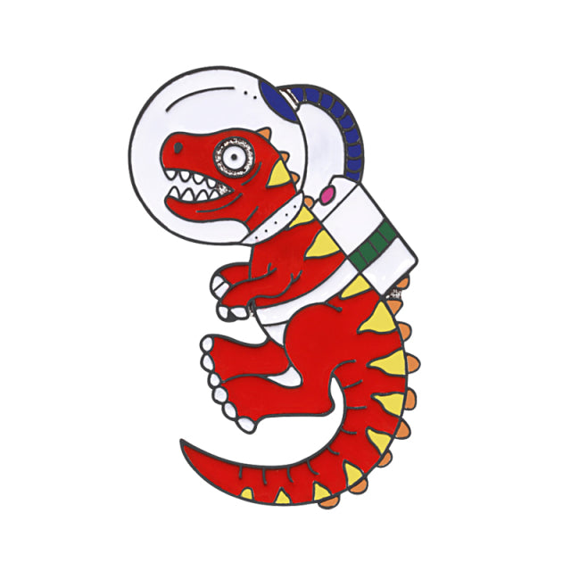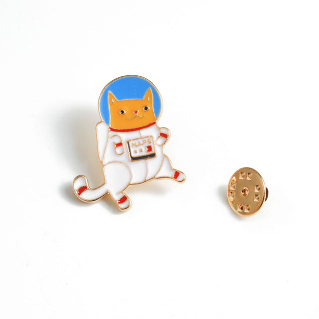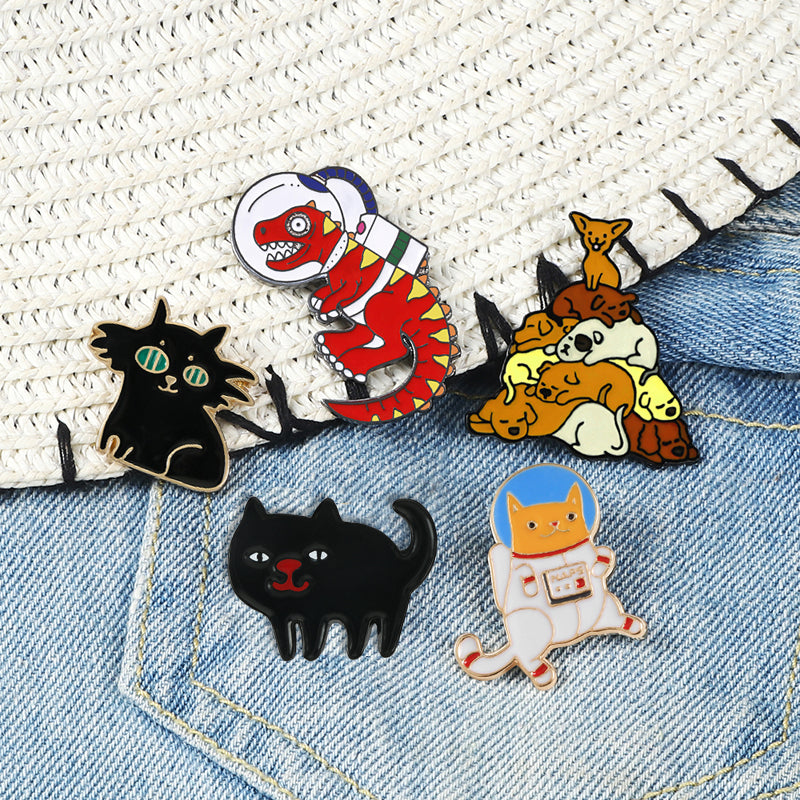 A dinosaur, astronaut dog, black cat, and sleeping puppy. The pins are made of zinc alloy and are considered a fashion accessory for both men and women. The pins can be worn on denim jackets or as lapel pins. The model number is BH and the pins come in various colors as shown in the pictures.