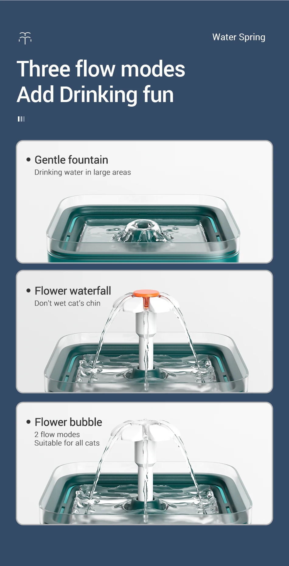 - Two flow modes: Gentle fountain / Flower waterfall / Flower bubble