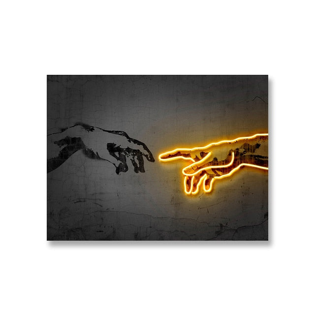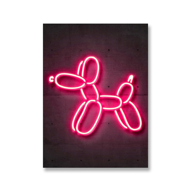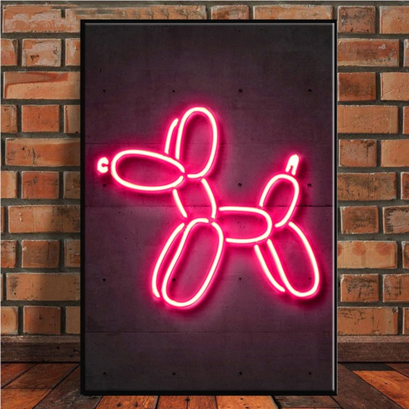 Upgrade your wall art collection with this stunning canvas print. Its high-quality materials, customizable features, and distinctive style make it a true masterpiece that will transform any space into a work of art. Add a touch of modernity and sophistication to your bar room or living area with this abstract balloon dog neon street art graffiti print poster.