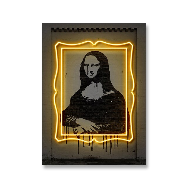 A canvas print of an abstract balloon dog neon street art graffiti with Mona Lisa speaker, intended for bar room decoration. It is a vertical rectangle shape, unframed, and made with waterproof ink on high-quality canvas. It is part of the Nordic poster style, with HD print technology. The painting is customizable and features wall pictures for living room, abstract oil painting, and vintage canvas painting.