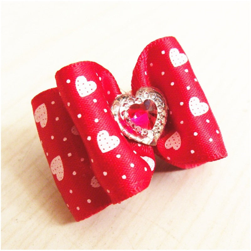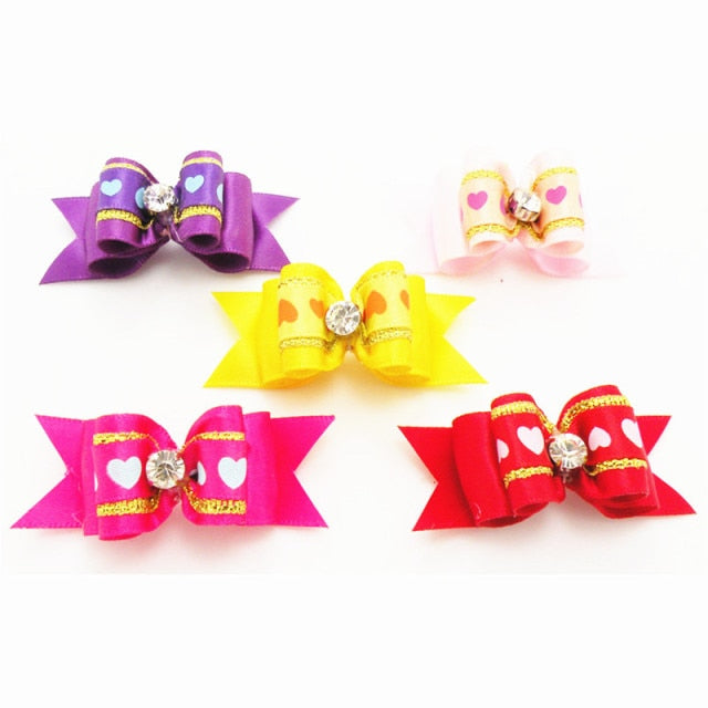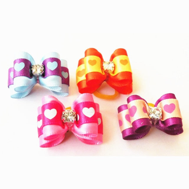 Dog grooming bows that are heart-shaped and come in various colors like red, purple, yellow, pink, and blue. These bows are made of ribbon and rhinestone and are about 4cm in size. They are considered holiday pet accessories and are meant for dogs.