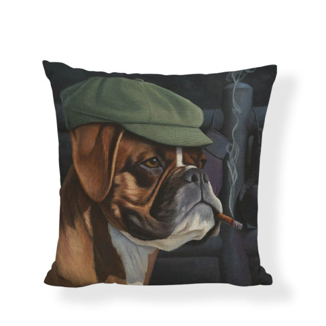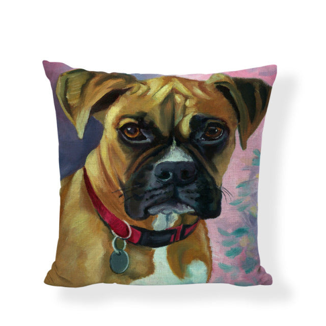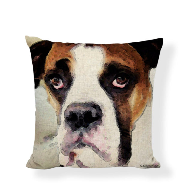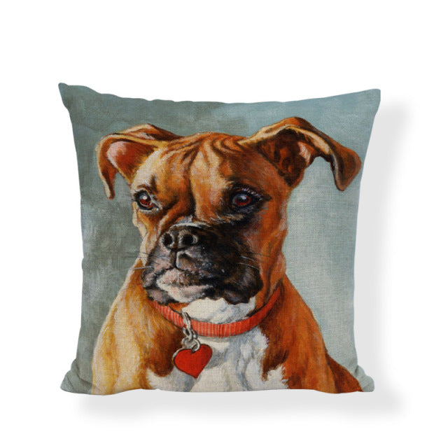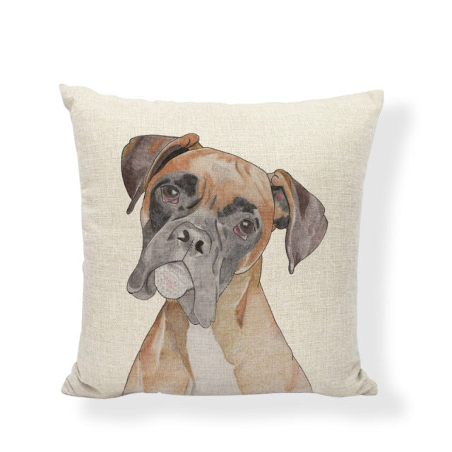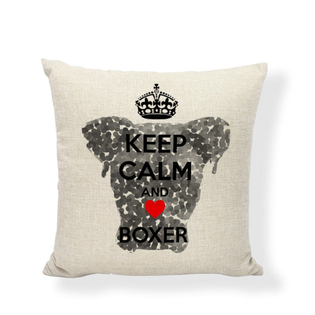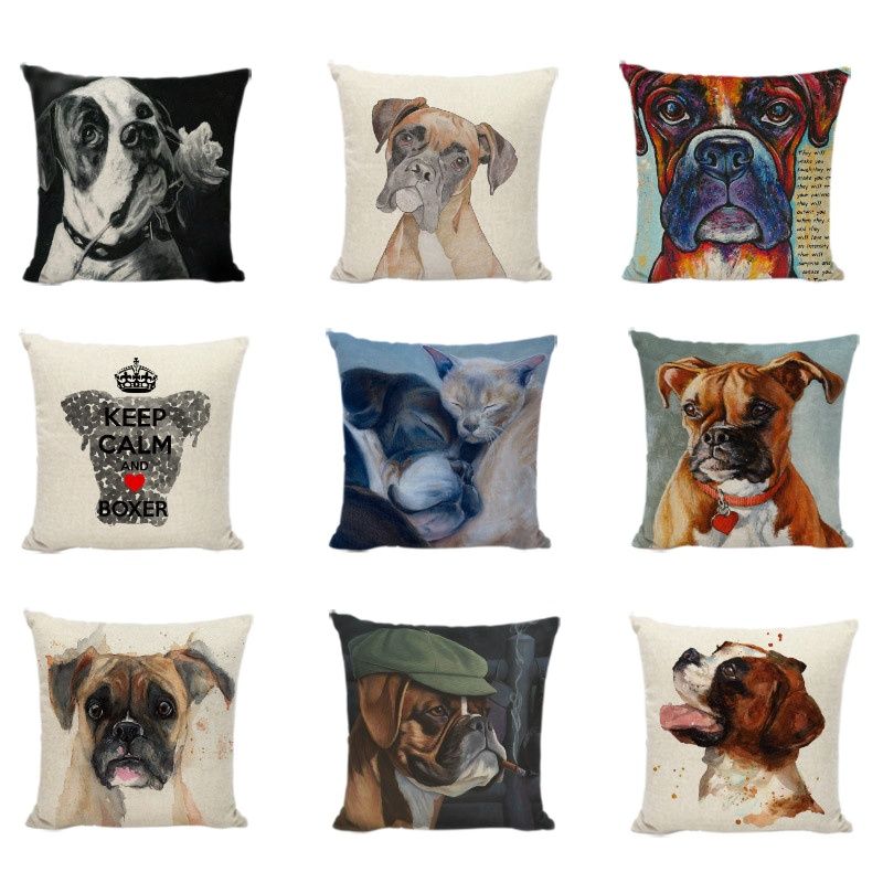 A cushion cover with a cute Boxer dog pattern that is handmade and printed on a square shape made of polyester and cotton material. It can be used for decorative purposes on chairs, car seats, bookcases, floors, and bedding. The cover has an invisible zipper and comes in two sizes. It can be used for various occasions such as parties, Christmas, and in hotels. The cover is available in two patterns, one with a watercolor Boxer dog and the other with black letters and a crown. The cover does not come with filling.