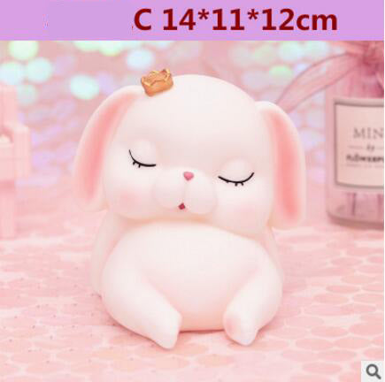 A cute cartoon dog figurine with a crown ornament made of resin. It is round in shape and comes in the color shown in the photo. It weighs between 0.2-0.35 kg and is used as a home decor item. It is hand printed and comes in the style of an animal. It can also be used as a piggy bank or a money box for rabbits.