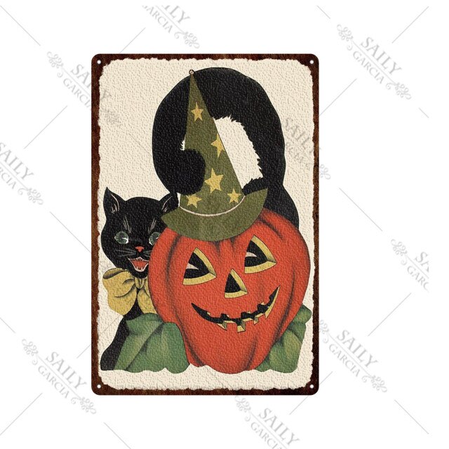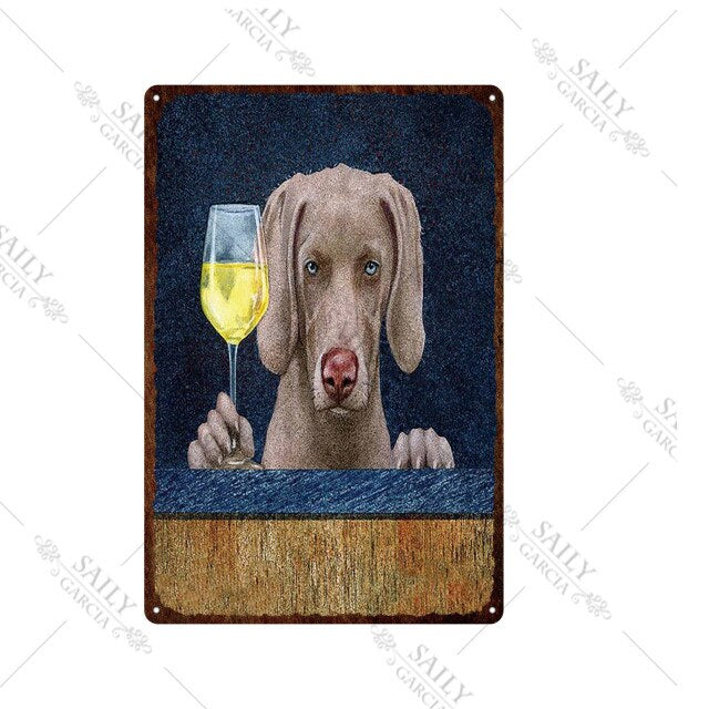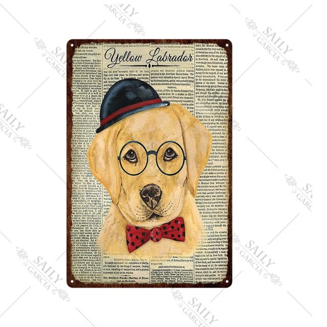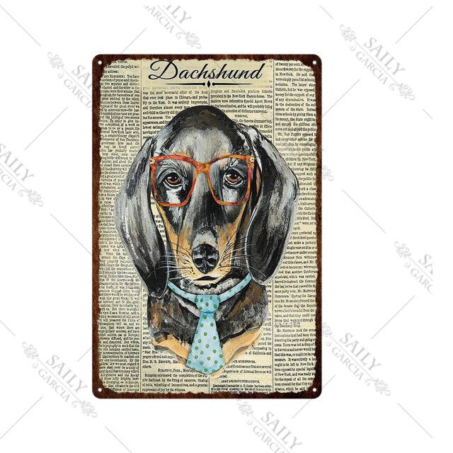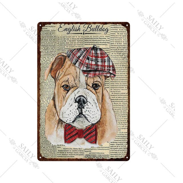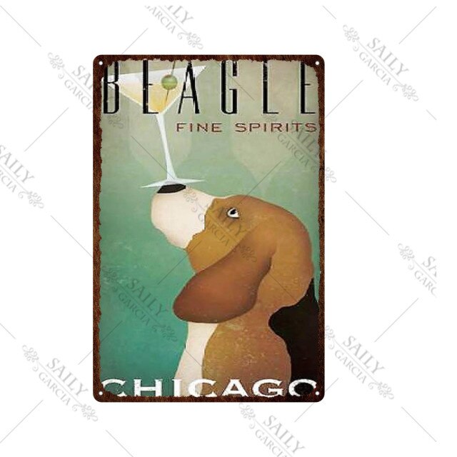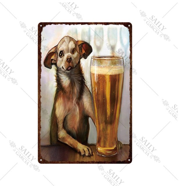 A metal sign plaque with a vintage design featuring cartoon animals (a cat and a dog) that can be used as a wall poster for home decor or in a bar. The item is customizable, has an American style, is shaped as a rectangle, and is made of metal. The model number is dog-18.