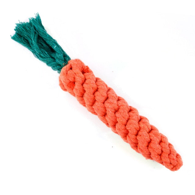 A chew toy for dogs that is shaped like a carrot and made of linen material. It is suitable for small dogs and can be used for teeth cleaning, outdoor fun, and training. It is categorized as a chew toy.