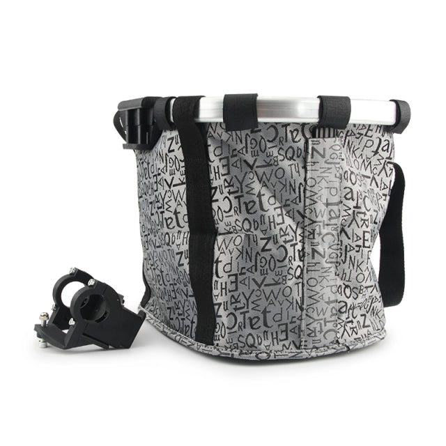 A cloth bicycle carrier basket that can also be used as a travel carrier for small cats or dogs. The material is steel and it is foldable for easy storage. It comes in four colors (purple, brown, black, and gray) and is designed in a mountain bike style. It is referred to as a bike bag.