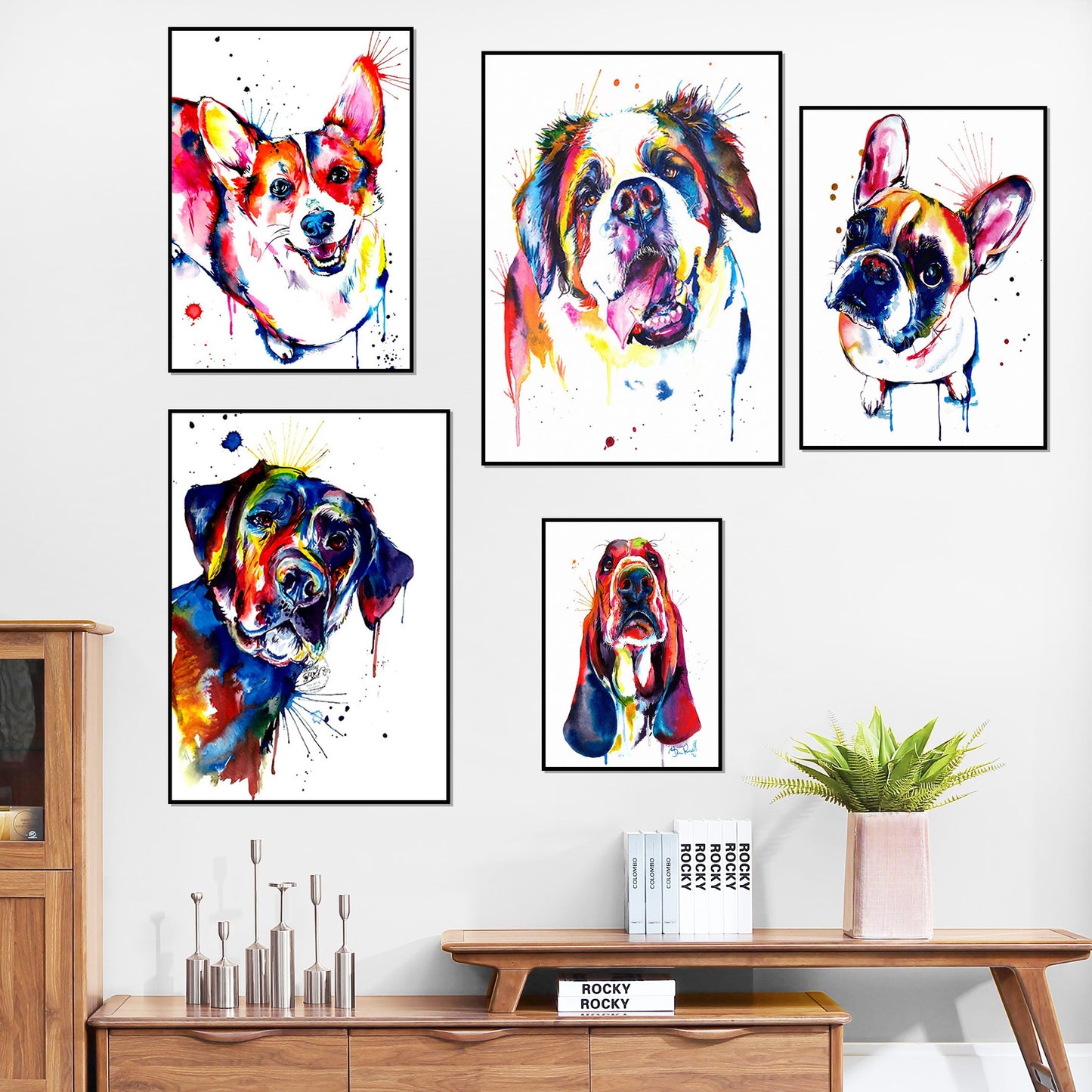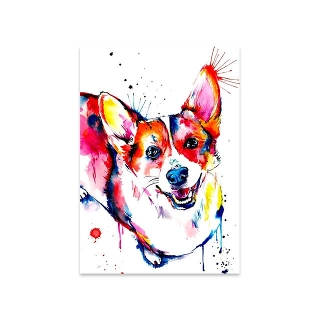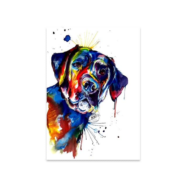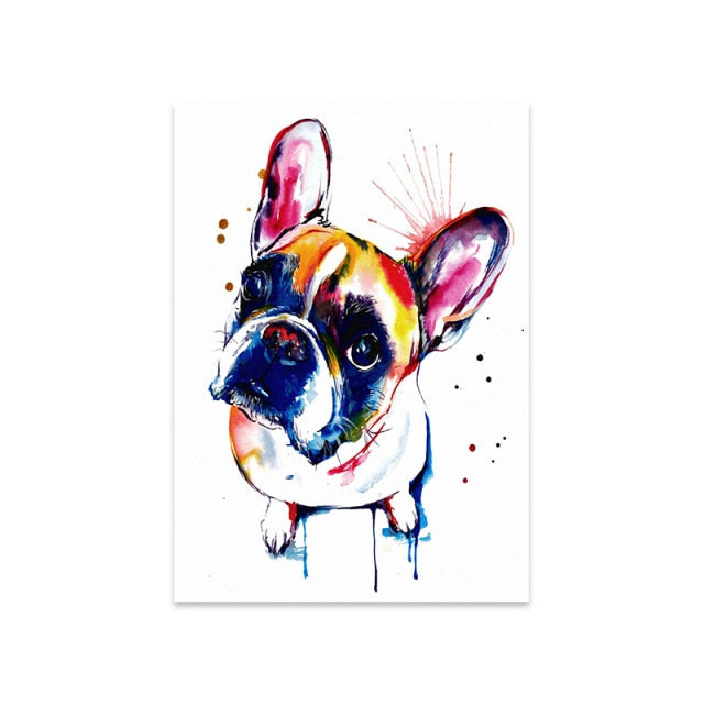 A canvas print of a colorful animal dog, specifically a French Bulldog, Labrador, or St. Bernard. The artwork is abstract and intended for wall decor. The canvas is supported by a waterproof ink and is not a smart device. The subject is an animal and the style is European. The canvas is customizable and is identified by the model number JJ171. The canvas is an original artwork that has been created using spray painting techniques. The canvas is in the shape of a vertical rectangle and can be framed. The material used for the canvas is canvas.