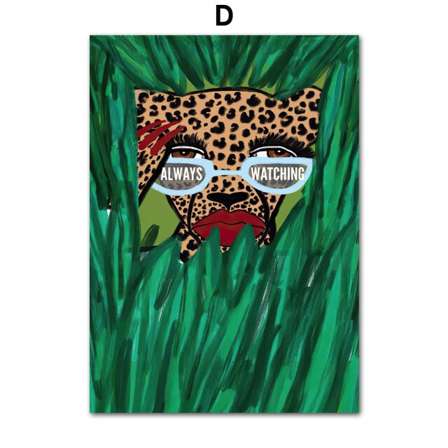This is a canvas print of an abstract tropical leopard woman and dog vase. It is unframed and shaped as a vertical rectangle. It is waterproof and oil-proof. It comes in a paper tube and is suitable for multiple scenes. It has a low price and good quality and includes a magnet butterfly as a gift. Customer requirements are met and it can be custom made.