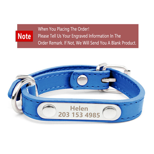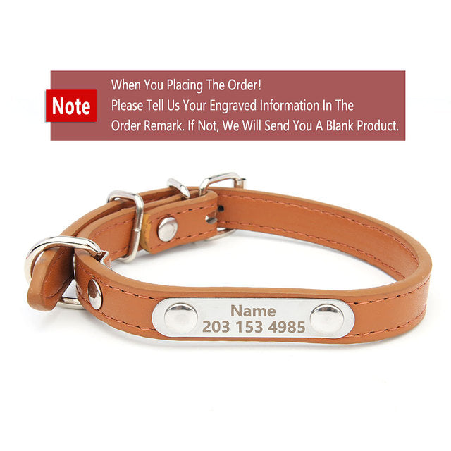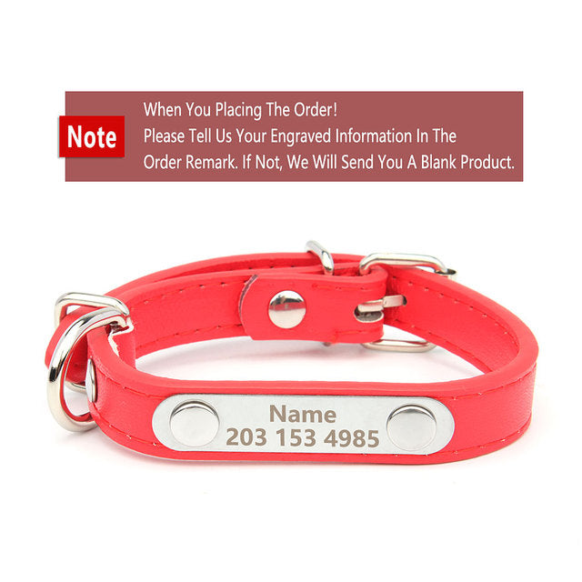 A personalized pet collar made of PU leather for small to medium dogs and cats. It comes in various colors and is customizable with the pet's name and phone number. It is a basic collar suitable for all seasons.