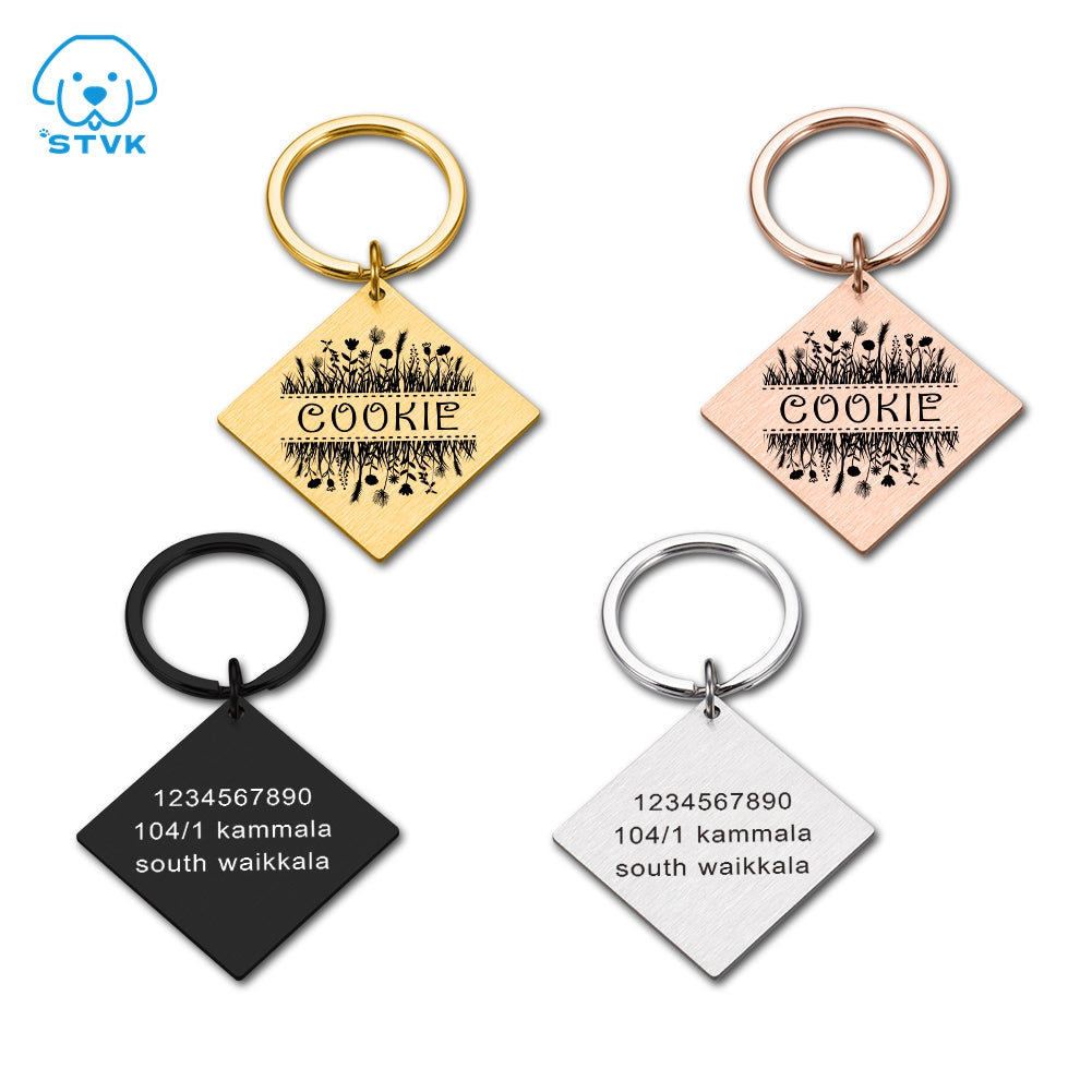 Our ID tag is available in four stunning colors: rose gold, gold, black, and silver. You can choose the color that best matches your pet's personality or your own personal style. The tag is designed in a square shape, adding a modern touch to your pet's collar.