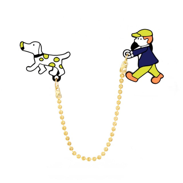 Cute Animal Pet Brooch Boy walk the dog Enamel Pins Lovely Cartoon Badge with Chain Jewelry Backpack Lapel Pin Gift for Children