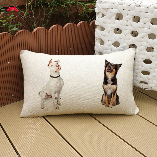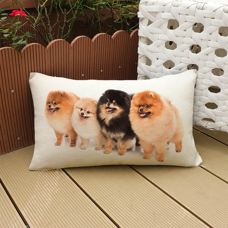 A cute dog print. They are handmade and come in a square shape with a size of 30x50cm. They can be used for decoration on a sofa, seat, chair or in a car. They are made of linen/cotton material and are customizable.