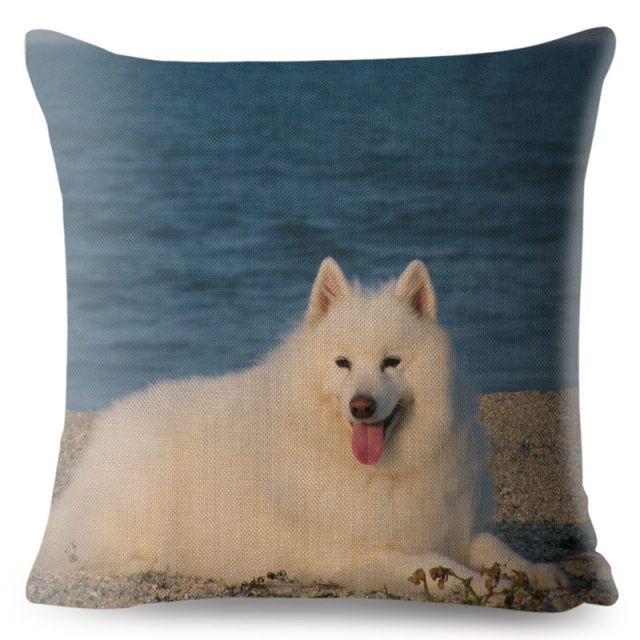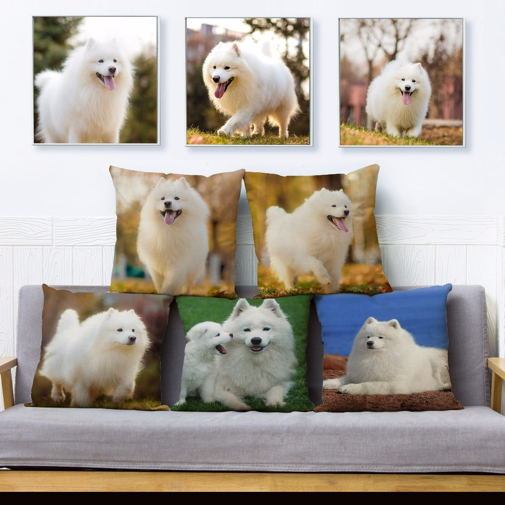 A decorative cushion cover with a cute Samoyed dog print. It is made of linen and cotton, measures 45x45cm, and weighs between 80-100g. It can be used to decorate sofas, chairs, beds, and cars.