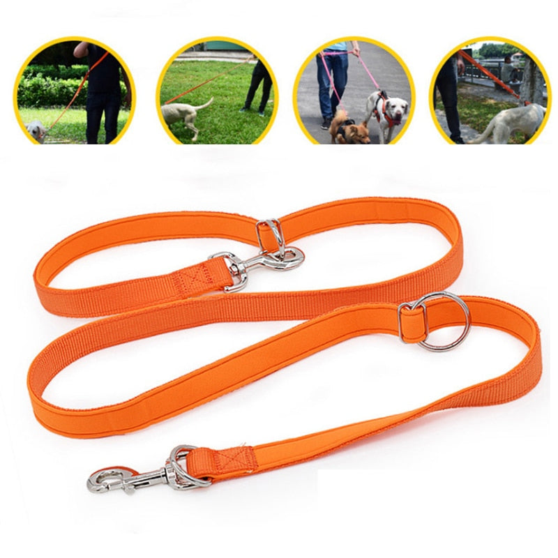 A double dog leash made of nylon material with padding for comfort. It can be adjusted to different lengths and is suitable for use in all seasons. It does not have any smart device features and is not customizable.