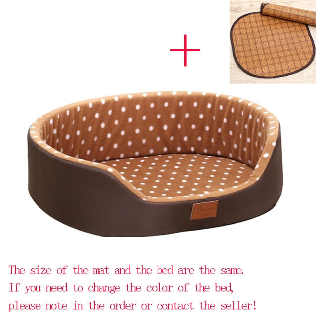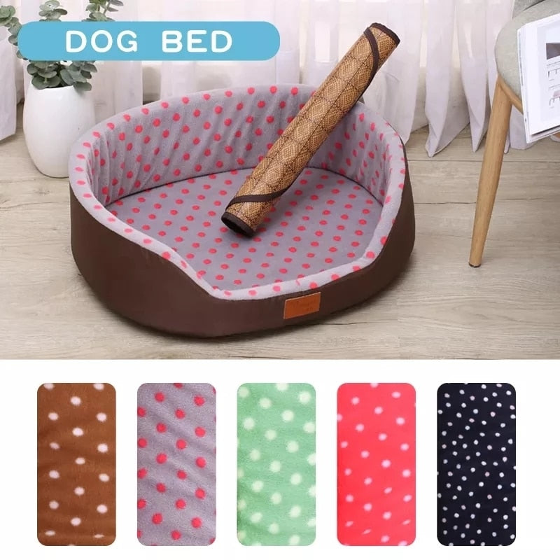A dog bed that is soft, comfortable, and durable, designed for small to medium-sized dogs and cats. It is available in different sizes and colors, and can be hand-washed. The bed is made of fiber material and features a dot pattern, and is suitable for use as a sofa, kennel, or cushion. It is also breathable and comes with a blanket.