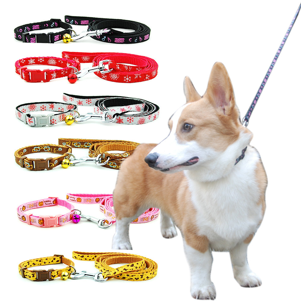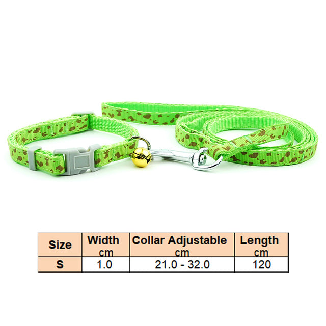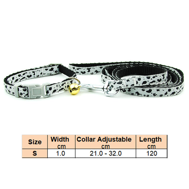 A set of adjustable pet collars and leashes with bells, suitable for cats, small dogs, and medium dogs. The collars come in various colors and patterns, and have features such as reflective stripes, quick release, and personalized options. The materials used are nylon and zinc-alloy hook, and the product is suitable for outdoor walking.