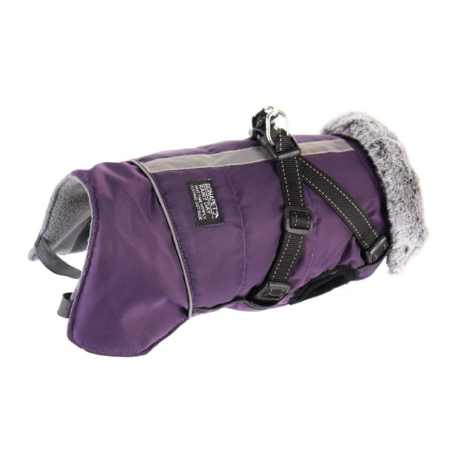 With a solid pattern and reflective accents, this jacket is also stylish and safe for night walks. Our jacket is designed with features such as a harness, fur collar, and padding for added comfort and convenience. Available in sizes for small and big dogs, including French Bulldogs, Golden Retrievers, and Pugs. Shop now and give your pup the best in dog clothing!