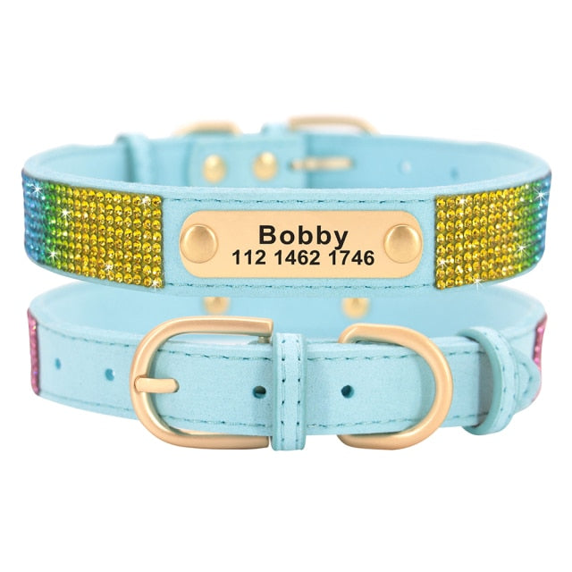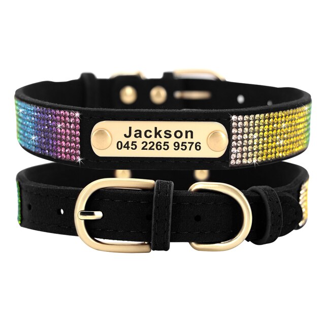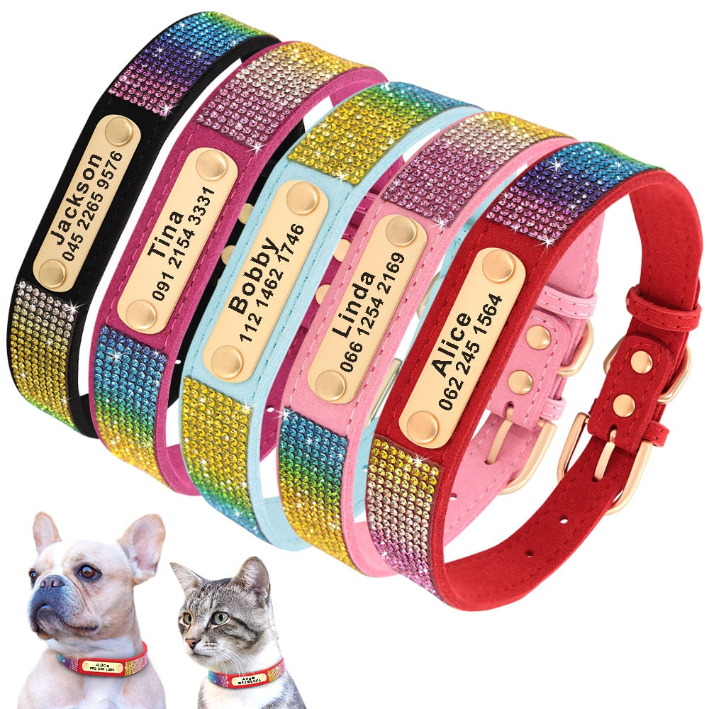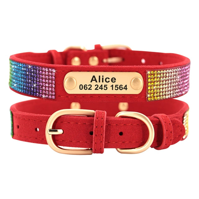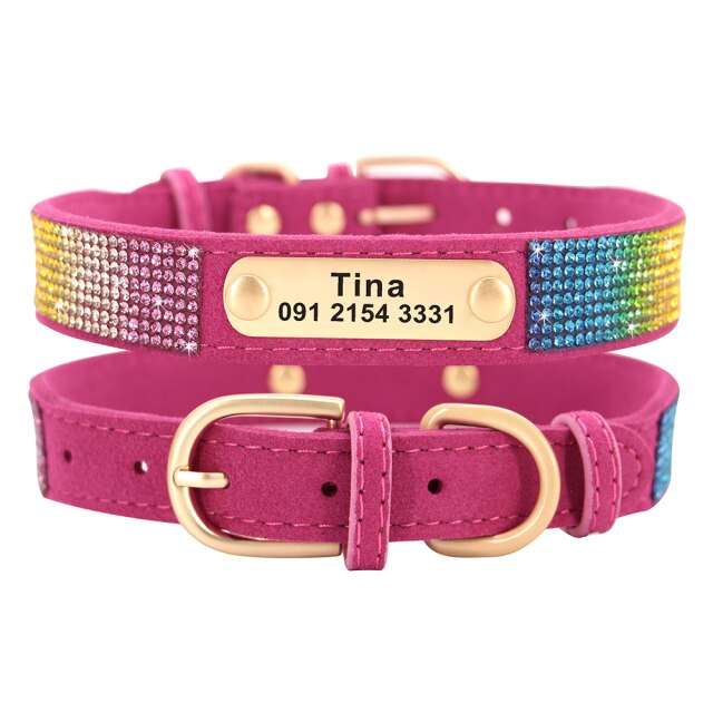 A customized dog collar with rhinestones and a personalized nameplate for small to medium-sized dogs and cats. The collar is made of suede leather and comes in various colors and sizes. It is suitable for all seasons and features a personalized and jeweled design. The product ID is CL310.