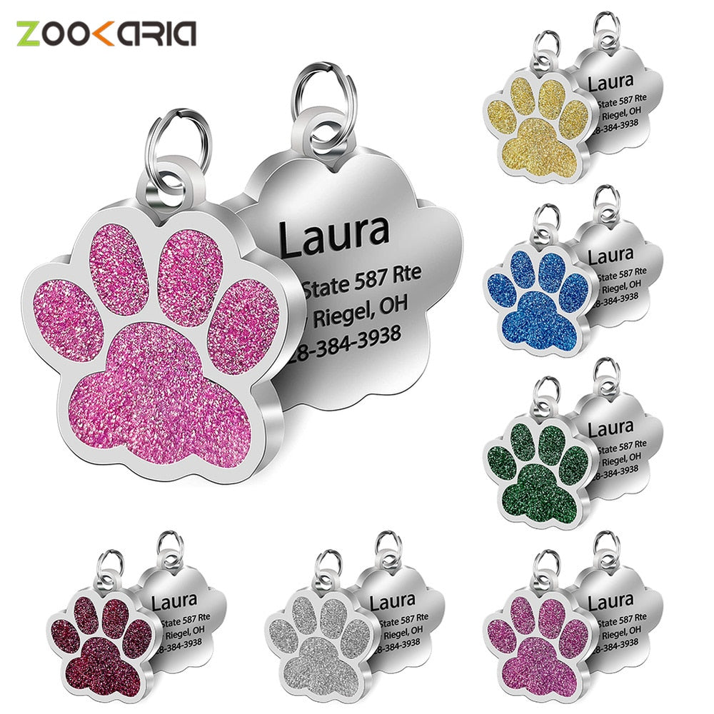 Personalized pet ID tags made of zinc alloy in the shape of a paw. They come in various colors and are suitable for all seasons and breeds of pets. The tags are engraved with the pet's name, number, and address, and can be customized and adjusted. They are used as a pet accessory.