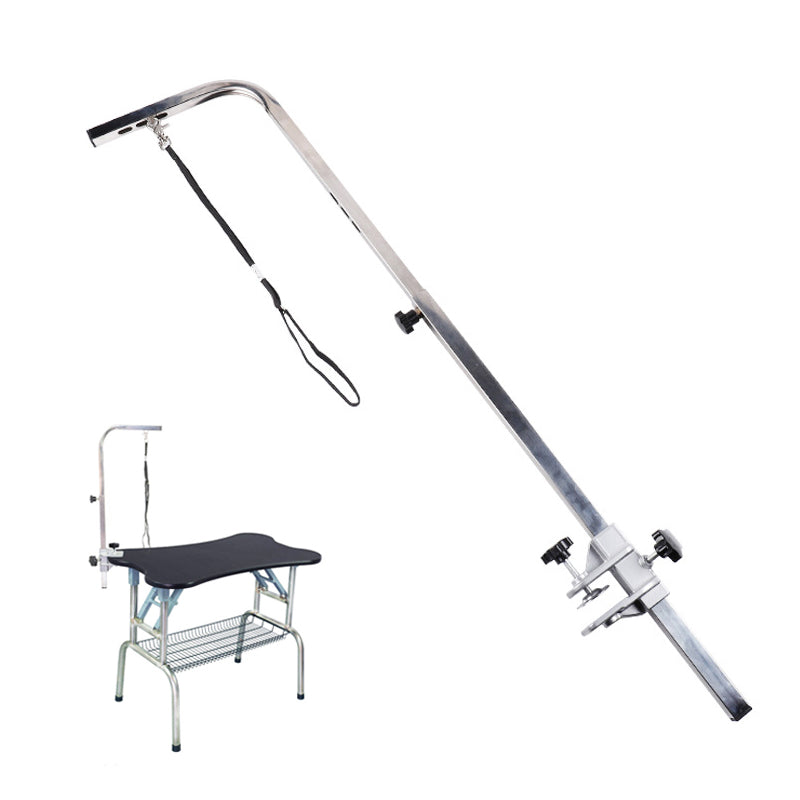 A pet grooming bracket made of stainless steel, with adjustable height up to 105cm and a maximum table thickness of 2.8cm. It also includes a sling and adjustable harness restraint line, and can be used for both cat and dog grooming. Its functions include being a pet grooming table accessory, pet bath holder, and dog grooming bracket.
