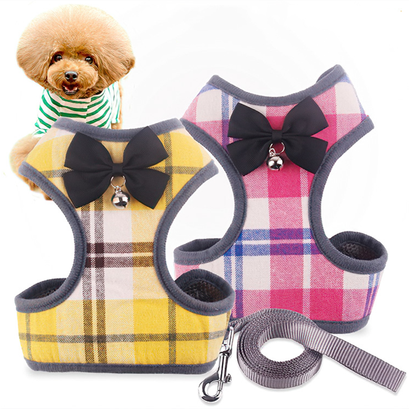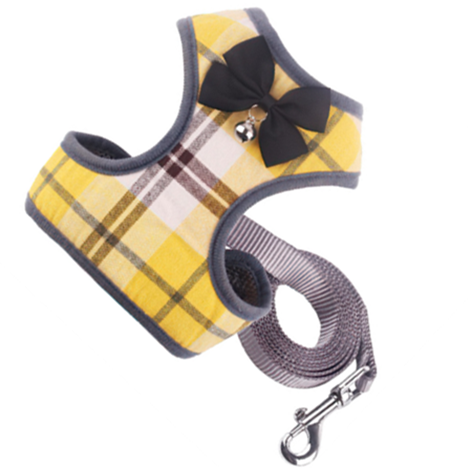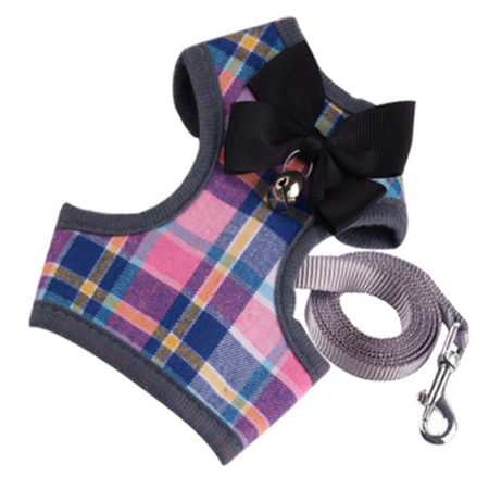 A pet harness and leash set for small dogs and cats made of nylon material with a breathable mesh chest strap. It features a bowtie, bells, breakaway, padded, and quick release features. The harness is designed as a vest and is suitable for all seasons, with a plaid pattern.