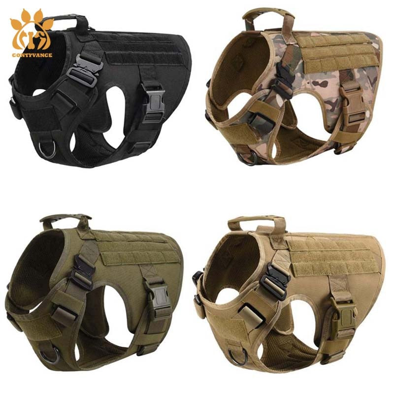 A tactical dog harness made of 1000D nylon that is suitable for medium to large dogs. It has a front leash clip to prevent pulling and a handle for better control. The harness also features MOLLE vest and is available in four colors. It is designed to be breathable and has cushioning to ensure comfort for the dog.