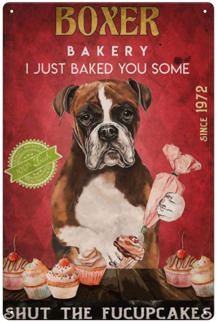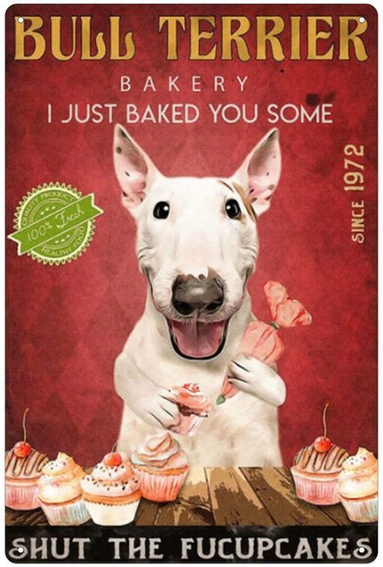 This is a metal sign with a picture of a bull terrier making a cake on it. It has a retro American style and is shaped like a rectangle. The model number is FRT555 and it is made of metal. It can be customized and used as wall decor in various settings such as bars, cafes, homes, and bathrooms.
