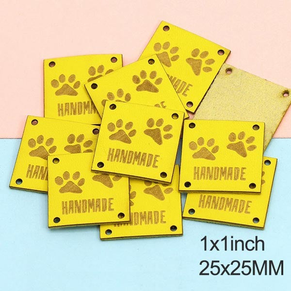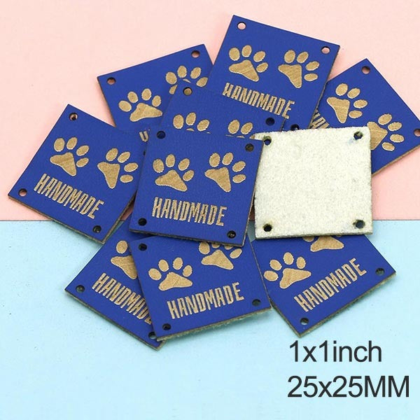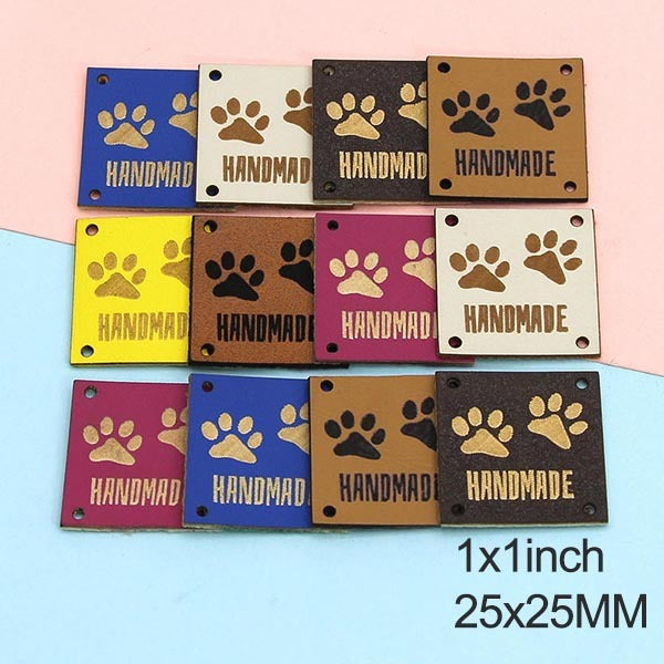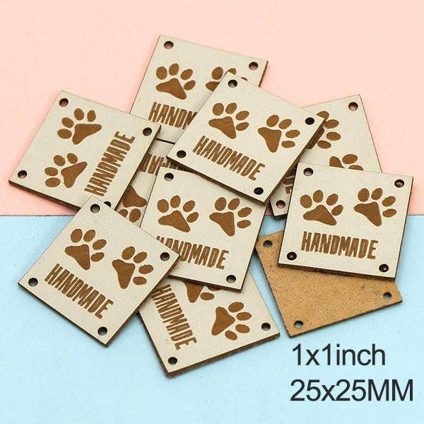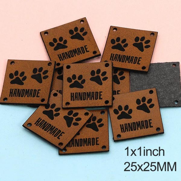 A set of 20 handmade leather tags with dog paw prints, which are washable and embossed. They are flag labels and can be used on garments, shoes, and bags. The tags are made of PU leather and are 25x25MM/1x1". They can be used for DIY crafts. The set is not customizable and is not available for wholesale.