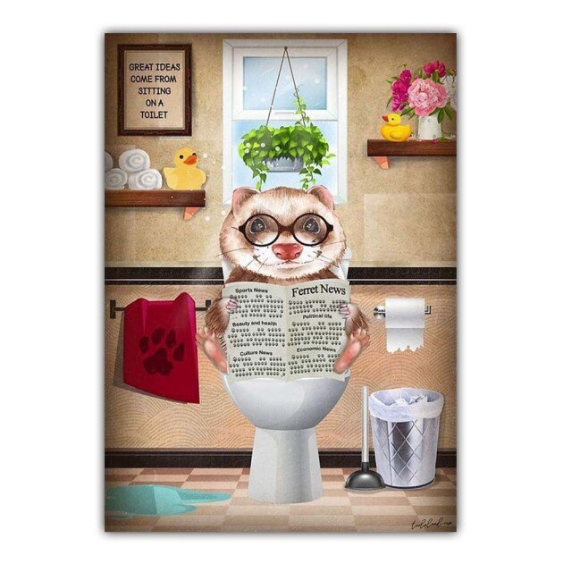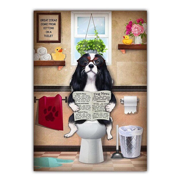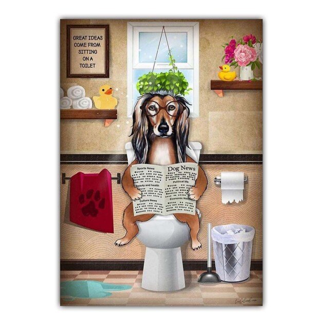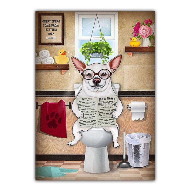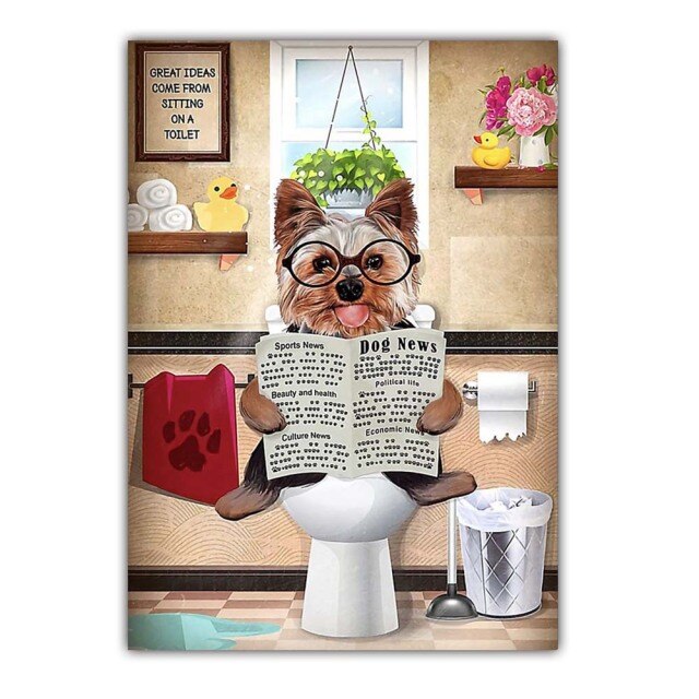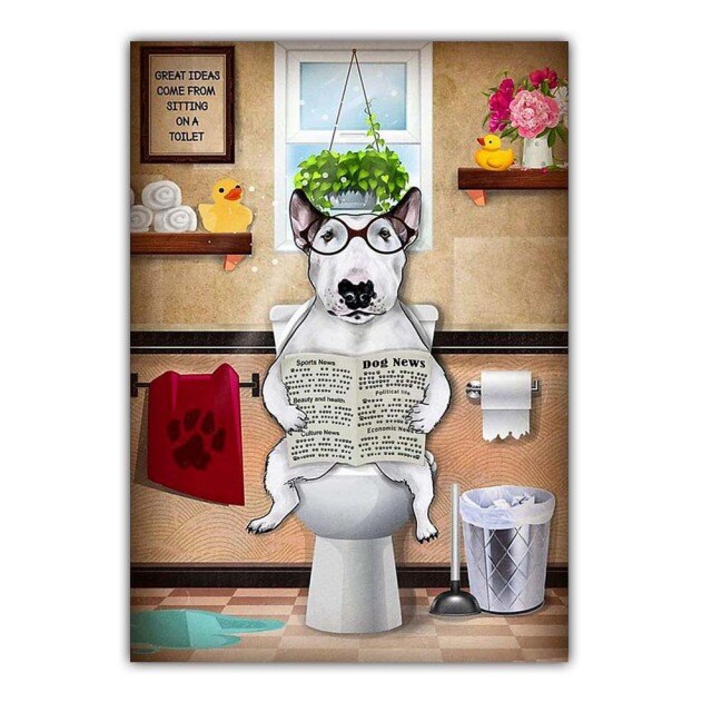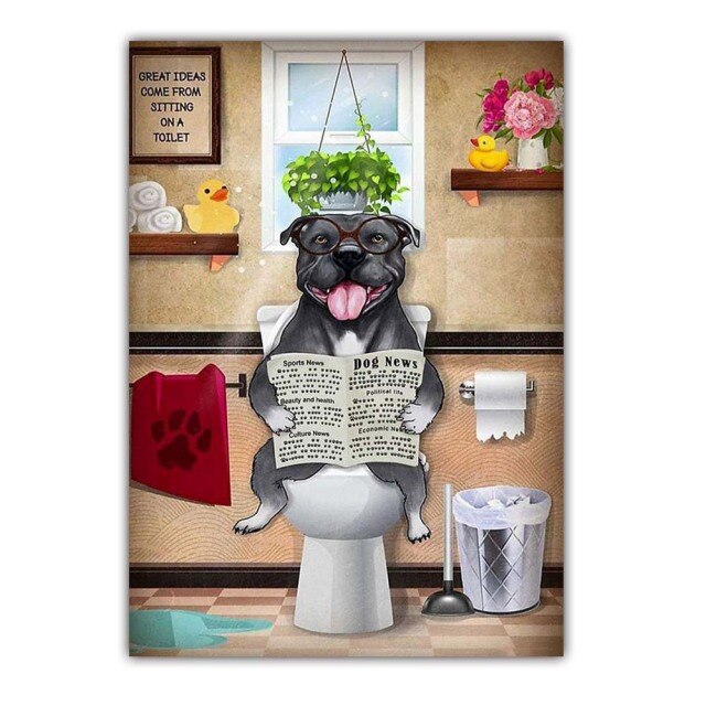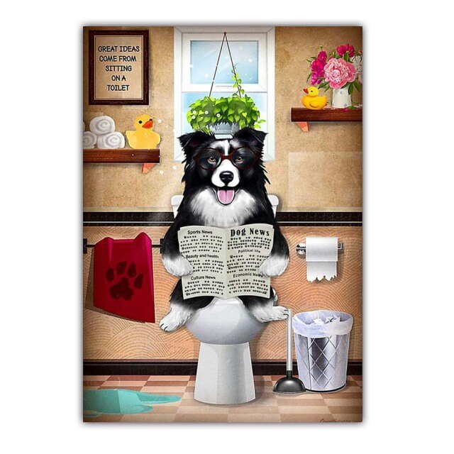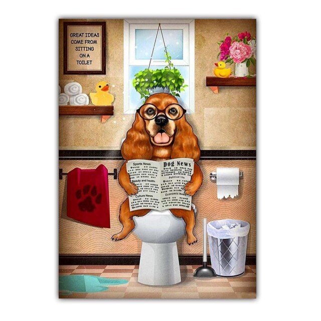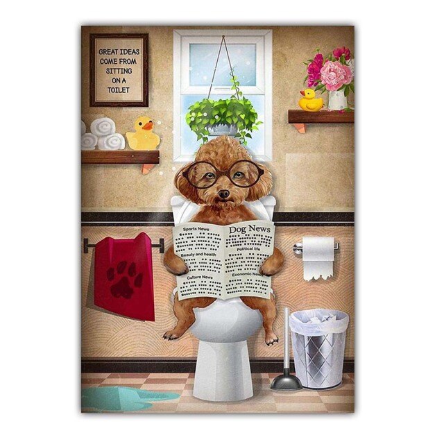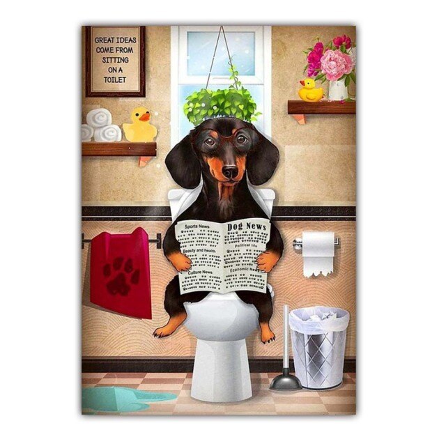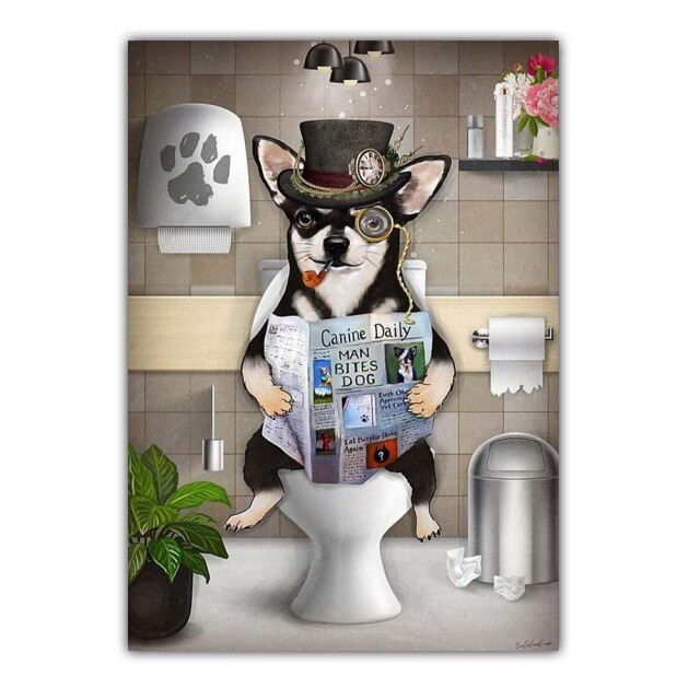 The vertical rectangle shape of the canvas adds a unique touch to any room. Hang this wall art poster in your living room, bathroom, or even in your office for a touch of humor and personality. Whether you're a dog lover or simply appreciate retro art, this canvas print is sure to bring a smile to your face. Transform your space with this delightful mural and enjoy the playful energy it brings to your surroundings.