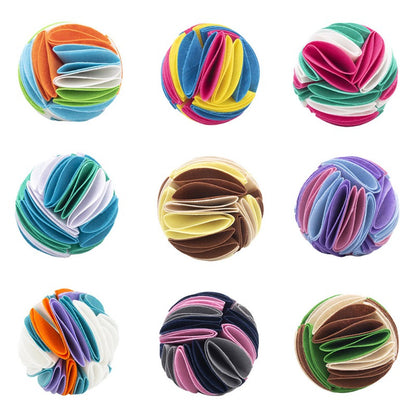 A slow feeding pad, a collapsible nose blanket toy, and a pet puzzle toy. All of these toys are designed to stimulate a dog's sense of smell and provide mental and physical stimulation. They are categorized as ball toys and are suitable for dogs.