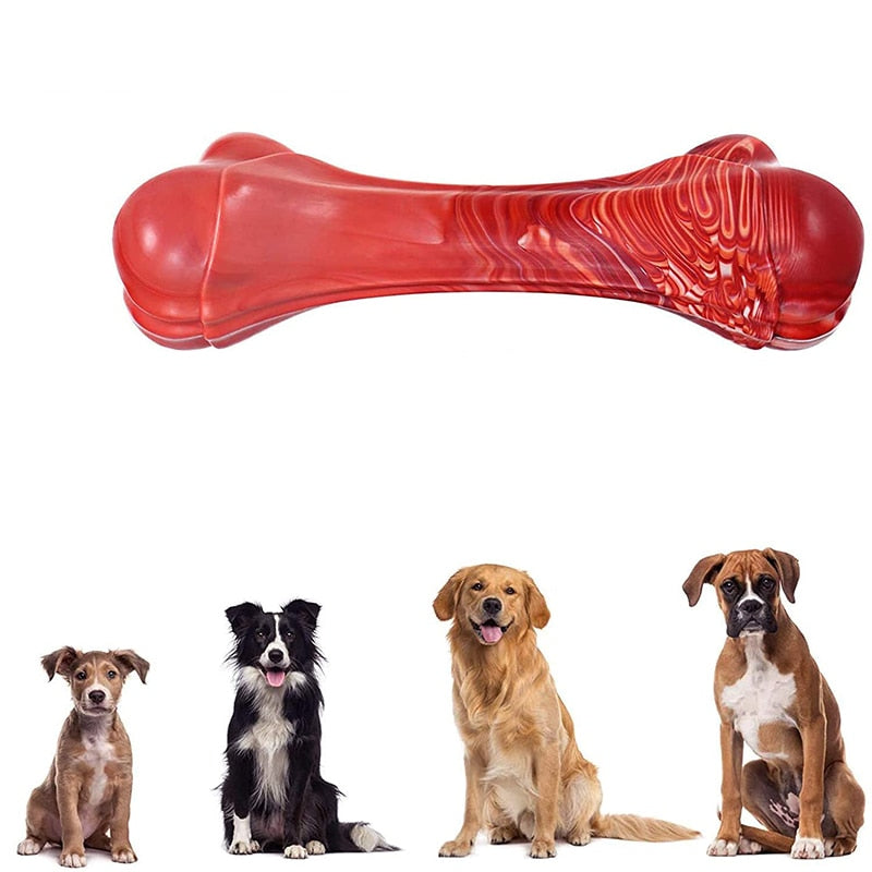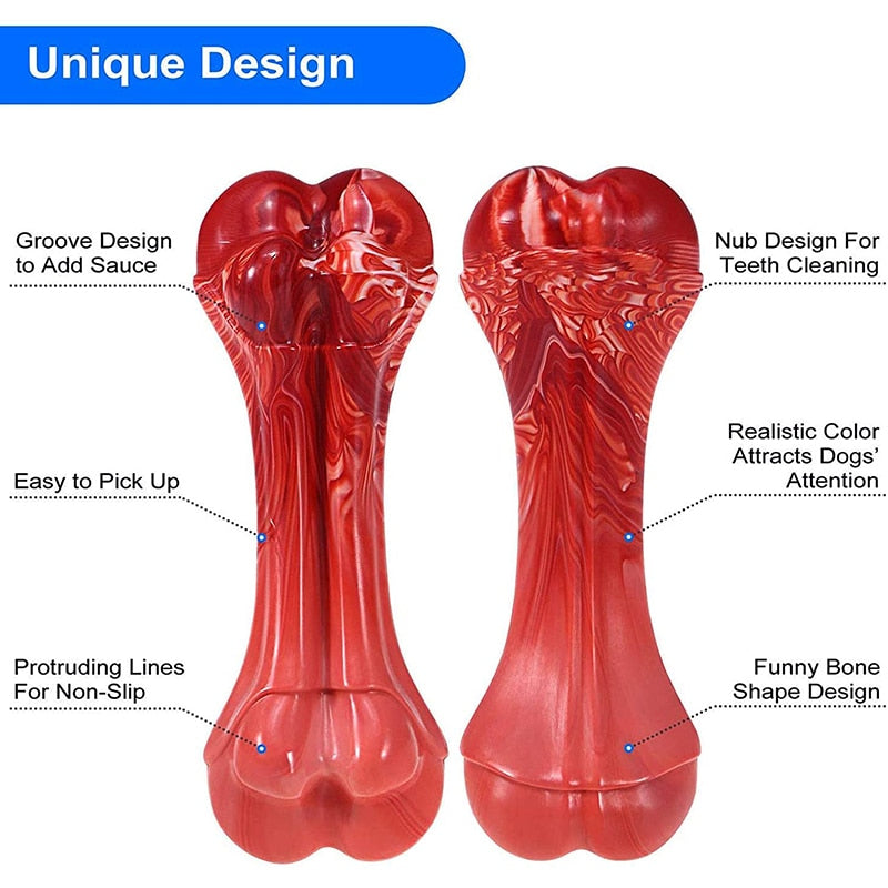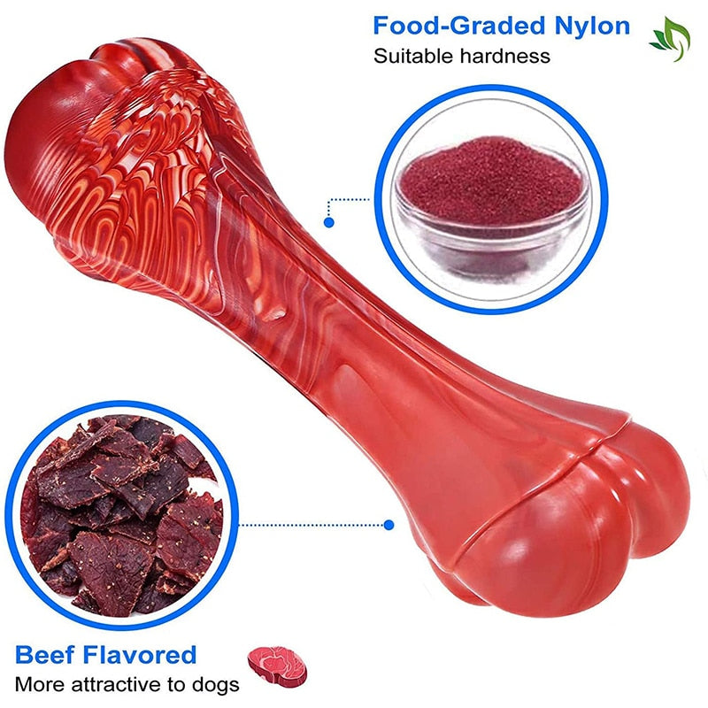 A chew toy for dogs made of durable nylon material and designed for aggressive chewers and teething puppies. It has a beef scent and is made of food-grade, eco-friendly material.