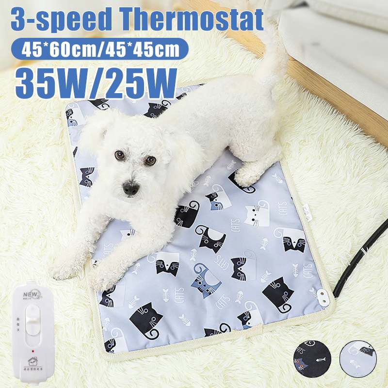 A waterproof electric pet heat mat that can be used for dogs and cats. It is made of non-woven fabrics and has a power of 50W or less. The voltage is 220V and it has a temperature control with two levels - low at 35 degrees and high at 50 degrees. It also has three switch gears - high, low, and off. It can be used as a winter warmer pad for pets or even on office chairs as heated seats.