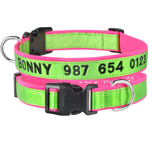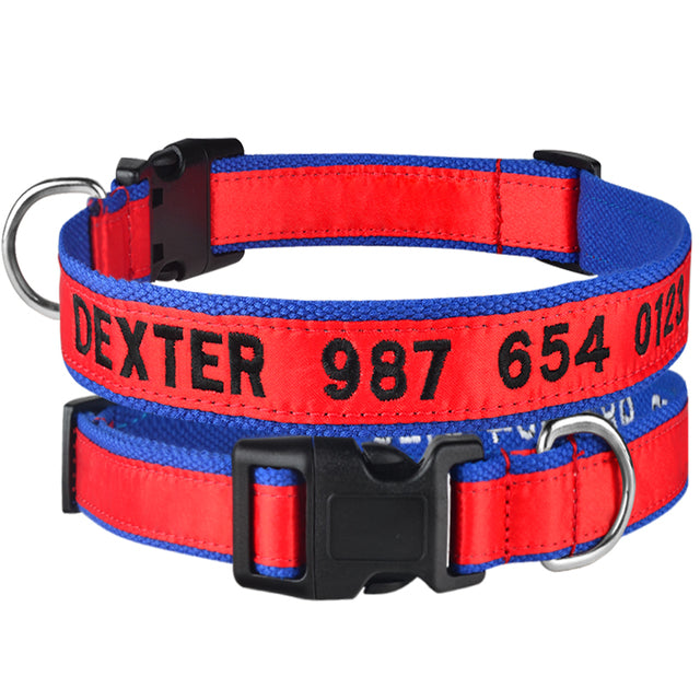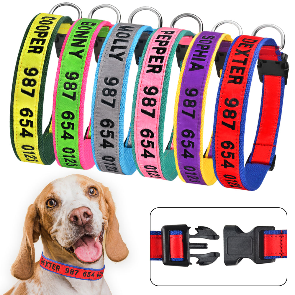 A personalized dog collar made of nylon material, suitable for both male and female puppies. It comes in various colors and sizes, and features embroidery and custom options. The collar is durable and can be used in all seasons.