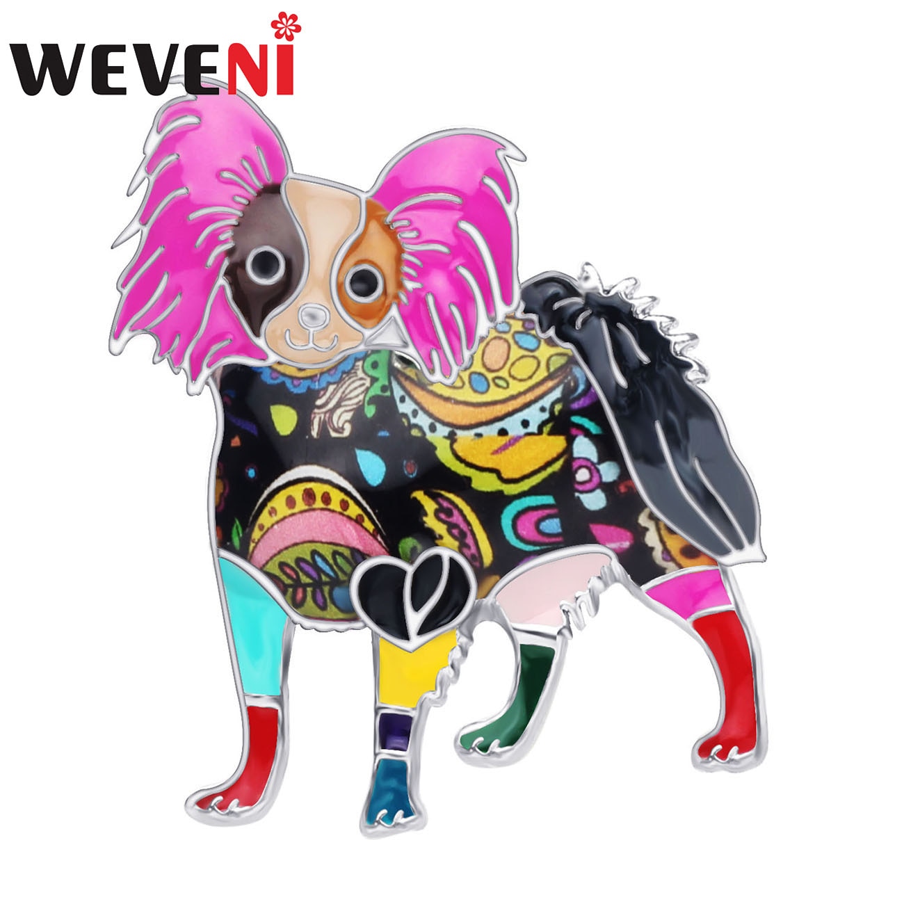 A brooch pin made of enamel alloy in the shape of a Papillon dog, suitable as a decoration for clothes or scarves. It is marketed as fashion animal jewelry for women and girls who are pet lovers, and is available in various colors.