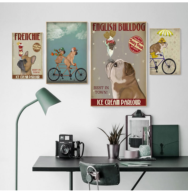English Bulldog Ice Cream Dog Painting Canvas Pictures for Living Room Dog Bicycle Wall Art Retro Posters and Prints Quadros