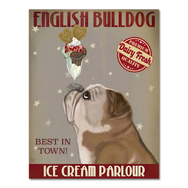 Canvas prints of English Bulldog ice cream dogs, bicycle dogs, and other animal subjects. The prints use waterproof ink and are in a modern style, with no frames included. The canvas prints are available as single pieces and are spray painted.