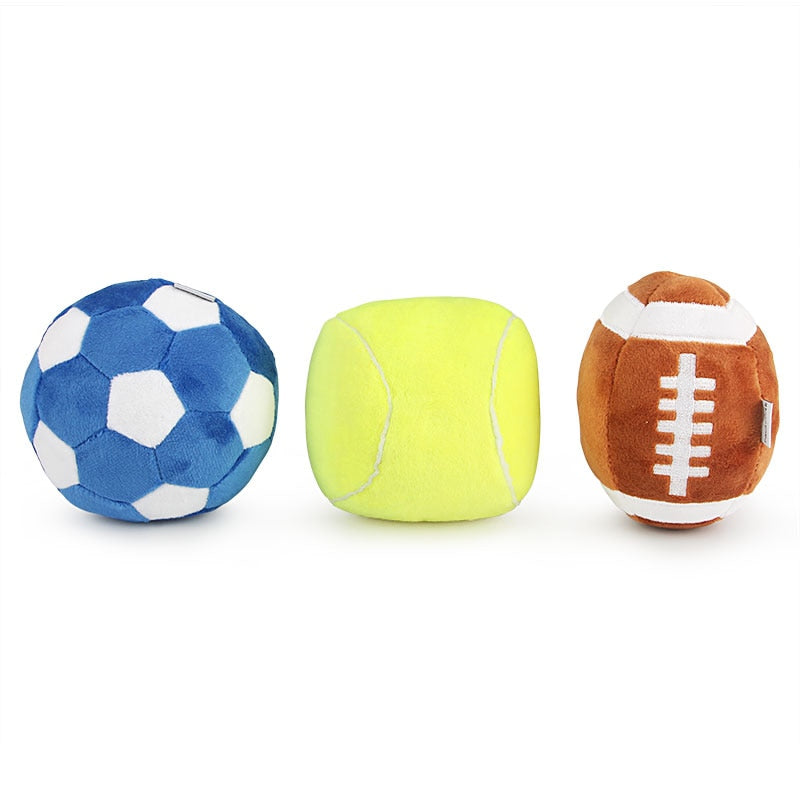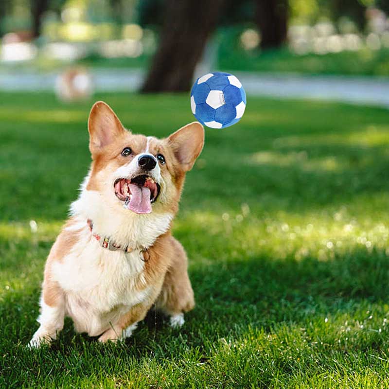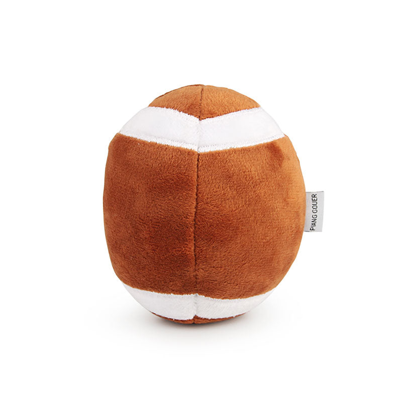 A cloth pet toy that is designed for dogs. It is a chew toy in the form of a football, tennis ball, or rugby ball. The colors available are blue, yellow, and brown. It is also described as a pet squeak toy.