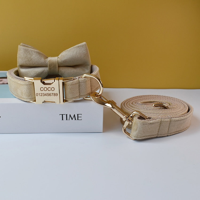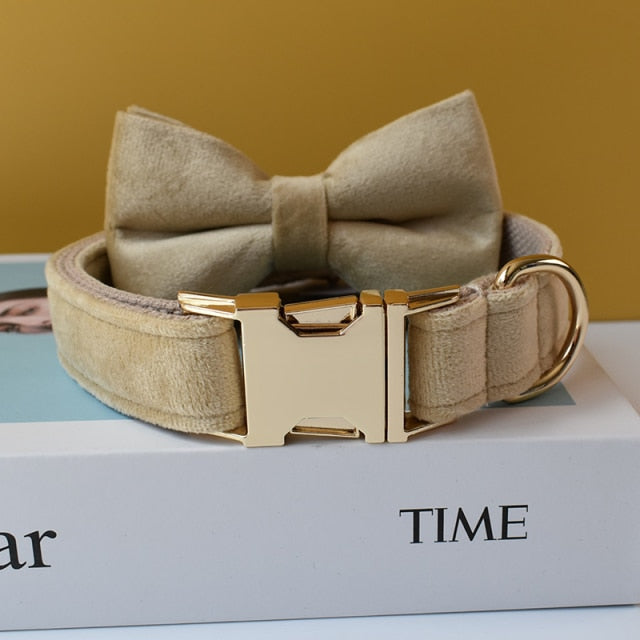 Free Engrave Fabric Dog Collar Leash Set For Medium Big Pet Necklace With Bow Tie Khaki Velvet Name Necklace Flannelette 09