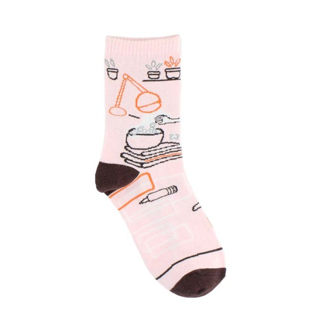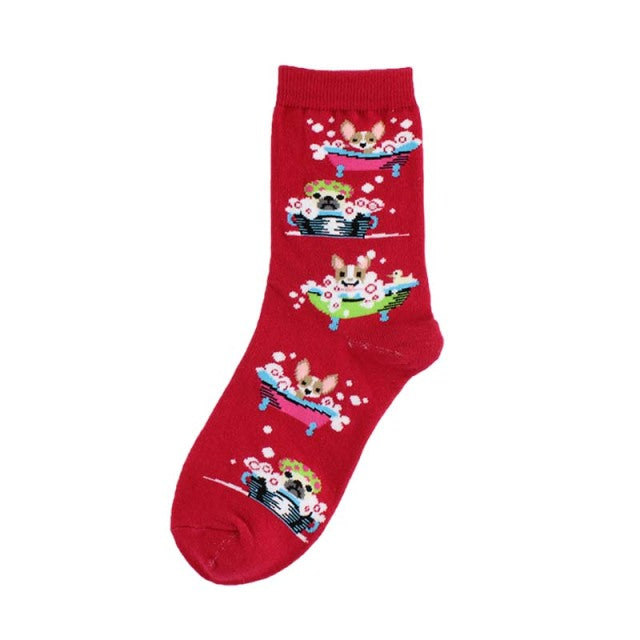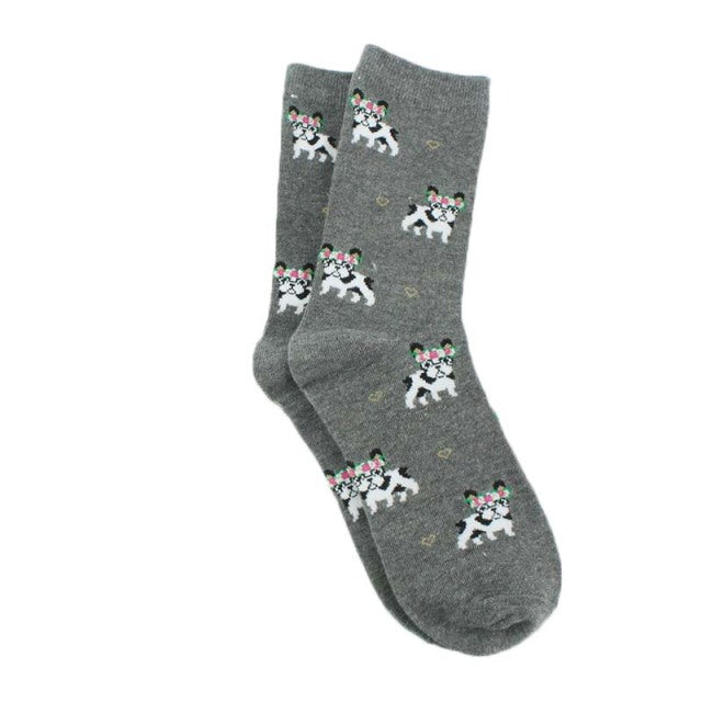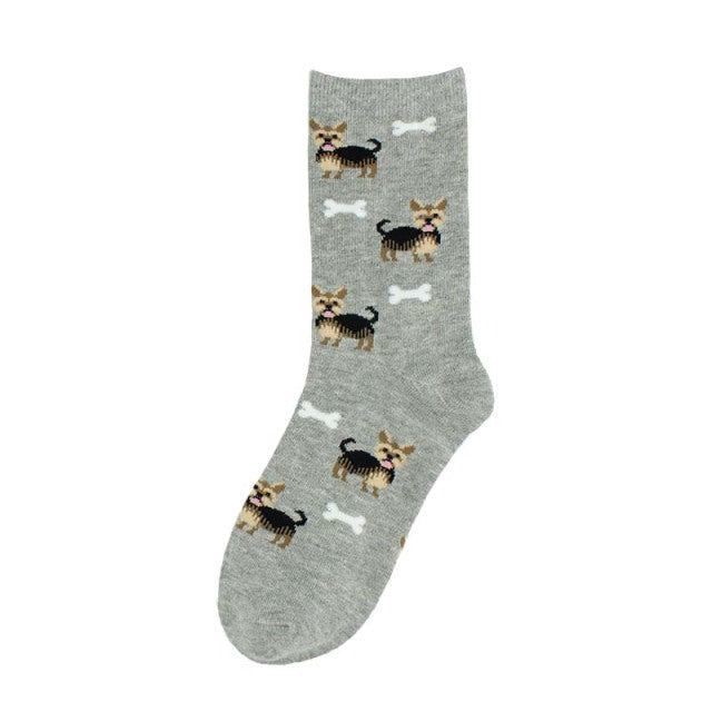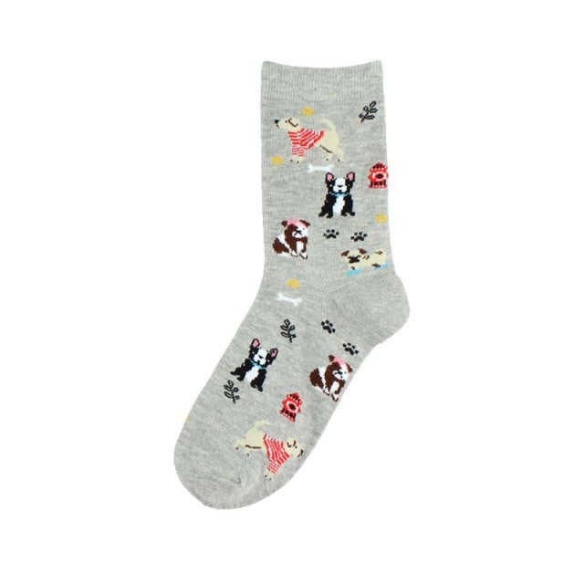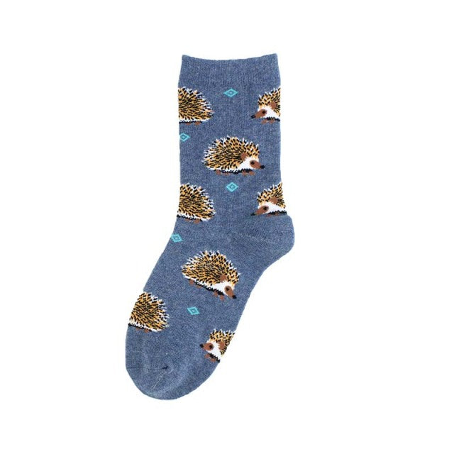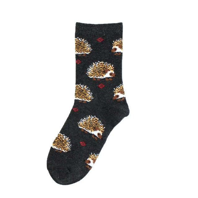 A pair of women's socks with a cute and creative animal pattern of hedgehogs, dogs, and breakfast eggs. They are made of cotton and polyester, have a standard thickness, and a middle tube height. The socks are casual and have features of being breathable and absorbent. They are suitable for gifting and can be worn at home, parties, shopping, and in daily life. The socks come in different models and sizes.