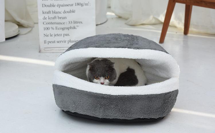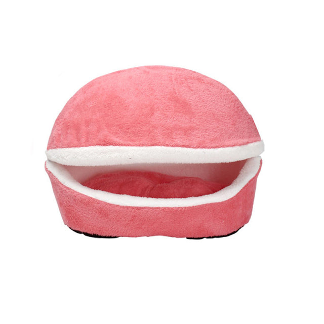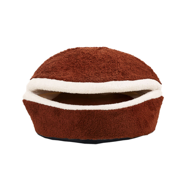 A cat bed designed to look like a hamburger, made of 100% cotton with a removable cover and skin-friendly short plush material. The bed includes a removable cushion and is suitable for small pets such as cats, small dogs, and guinea pigs. It is foldable, windproof, and has a cuddle comfort enclosed design. The bed is attractive, durable, washable, and suitable for use in the winter.
