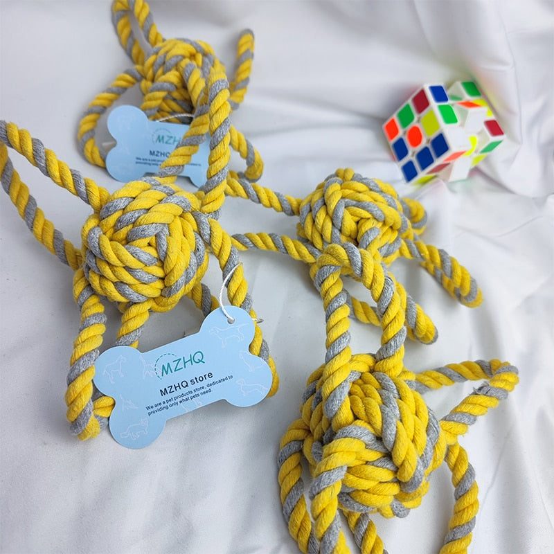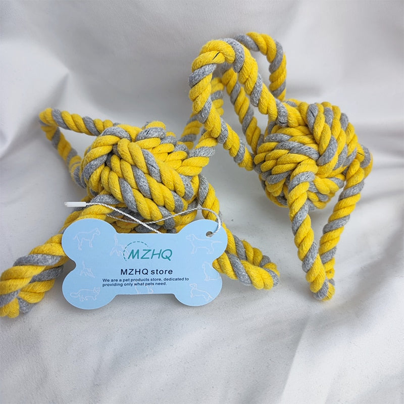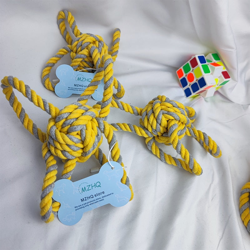 A dog toy called "Four Ears Ball", which is made of bite-resistant cotton rope and comes in yellow and gray. It weighs 92g, is 22cm long, and has a ball diameter of 5.5cm. It is designed for puppies to chew on and clean their teeth.