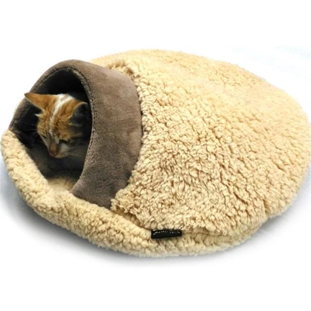 A winter bed for cats made of soft plush material. It is a cozy and portable sleeping bag cushion that can also be used for small dogs. The bed is made of breathable wool material and is not a smart device.