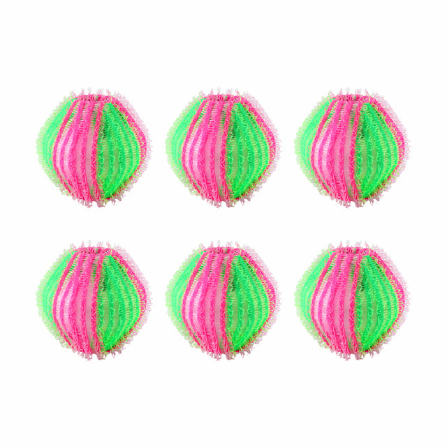 A product called a laundry ball, which is used for cleaning clothes and removing hair. The product is portable and comes in a set of six. It is designed to catch pet hair and clean washing machines.