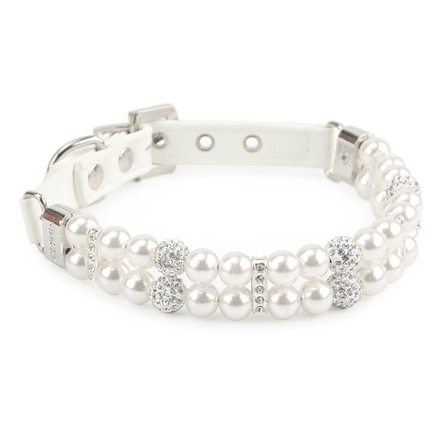 A pet collar made of PU leather with artificial pearls and rhinestones, designed for small dogs. It is a basic collar with a solid pattern and comes in white or black. It is not a smart device and is not customizable. The collar is suitable for all seasons and has a jeweled feature. The style is a pearl dog collar.