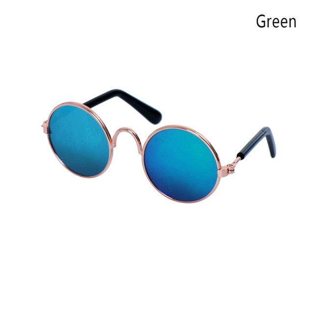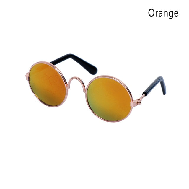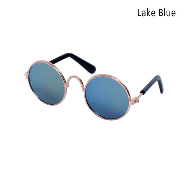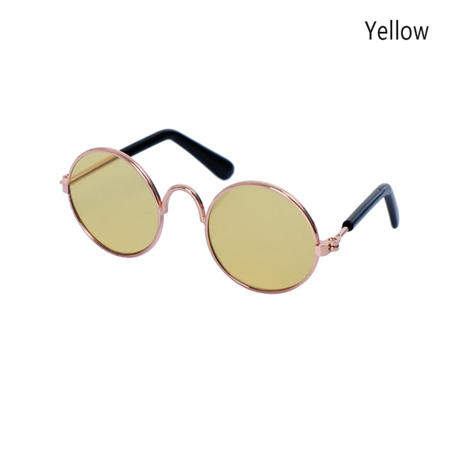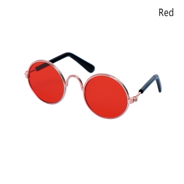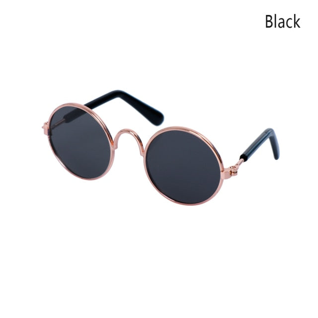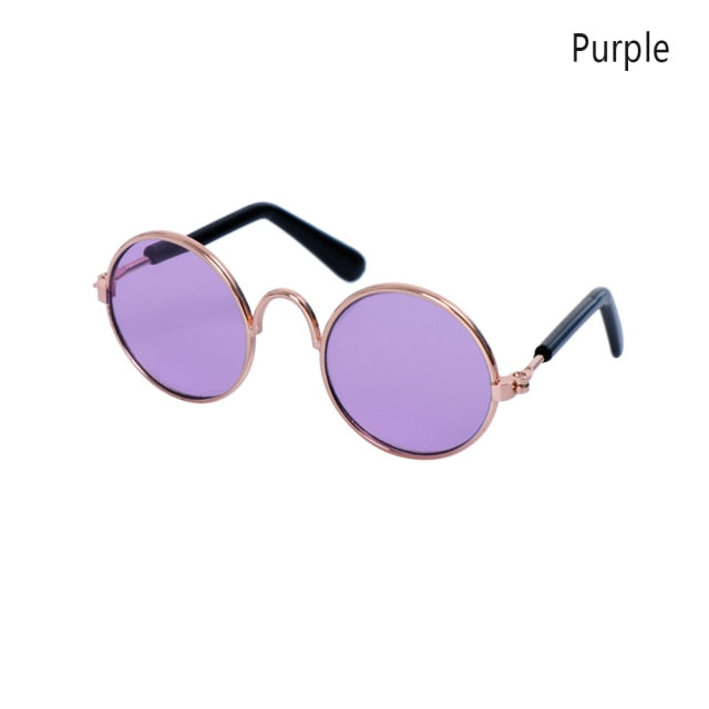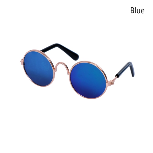 A product for pets, specifically cats and small dogs, that are sunglasses designed to protect their eyes. The item is made of metal and can be used for taking photos or as an accessory for pets.