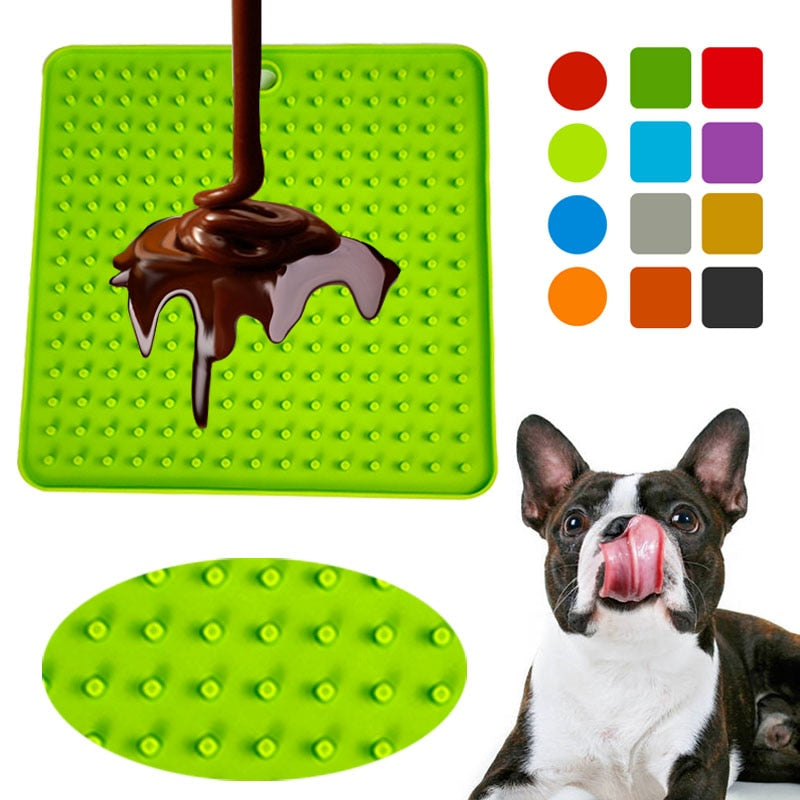 A silicone licking mat that can be used as a slow feeder for dogs and puppies. It comes in different shapes and colors and has features such as distraction during dog washing and treat dispensing. It can also be used as a food bowl for big dogs and to prevent suffocation.
