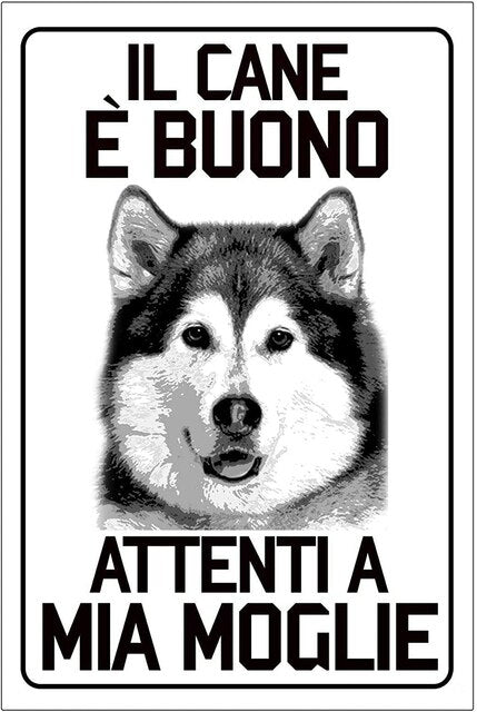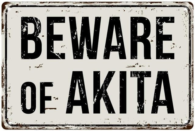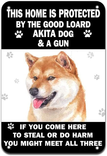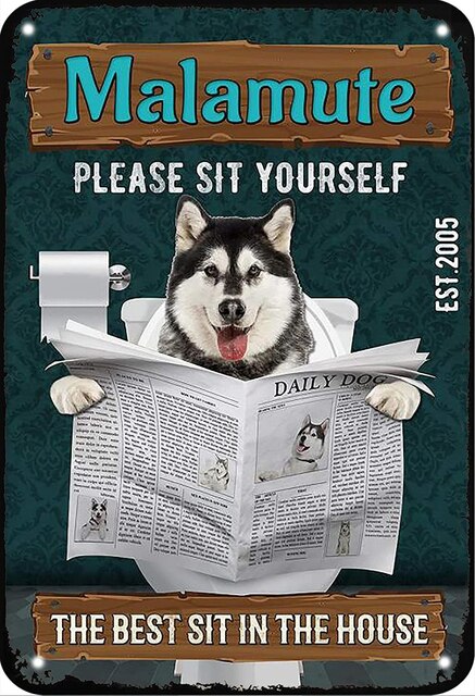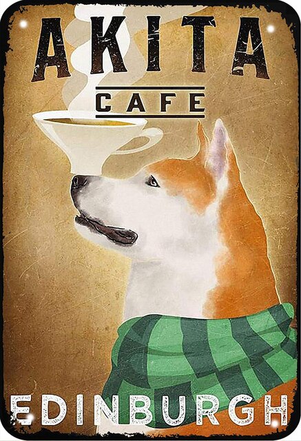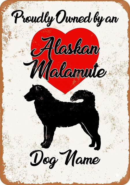 A product for home decoration: metal plates in the shape of a rectangle with a vintage and retro design. The plates feature images of Alaskan Malamute and Akita dogs, as well as a movie poster. The product is customizable and made of metal.
