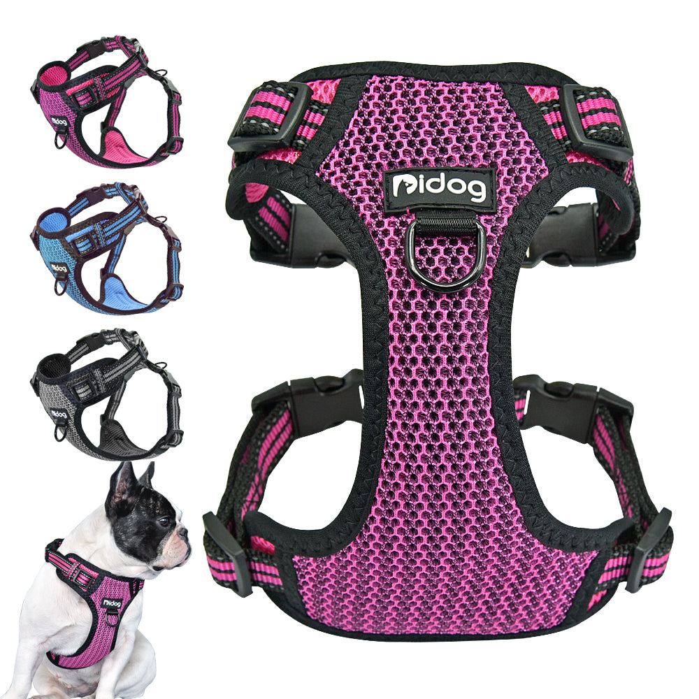 A no-pull nylon dog harness that is reflective and adjustable for small, medium, and large dogs such as pitbulls and French bulldogs. It is available in black, blue, and rose colors and comes in sizes S-XL. The harness is padded for comfort and can be used for training and walking.