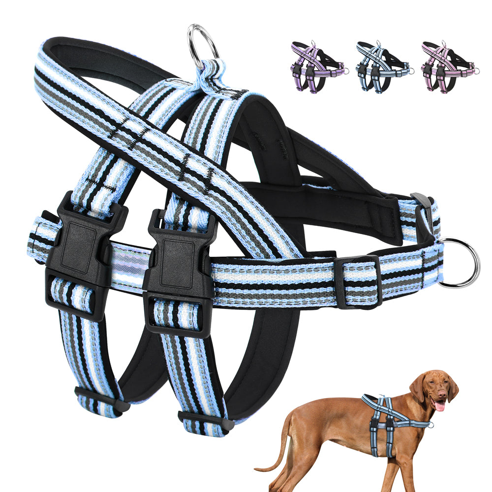 A nylon dog harness that is adjustable and suitable for medium to large dogs such as Pitbulls and Bulldogs. It is padded and has a reflective feature, making it suitable for walking and training in all seasons. The harness is available in blue, pink, or purple and comes in sizes S, M,